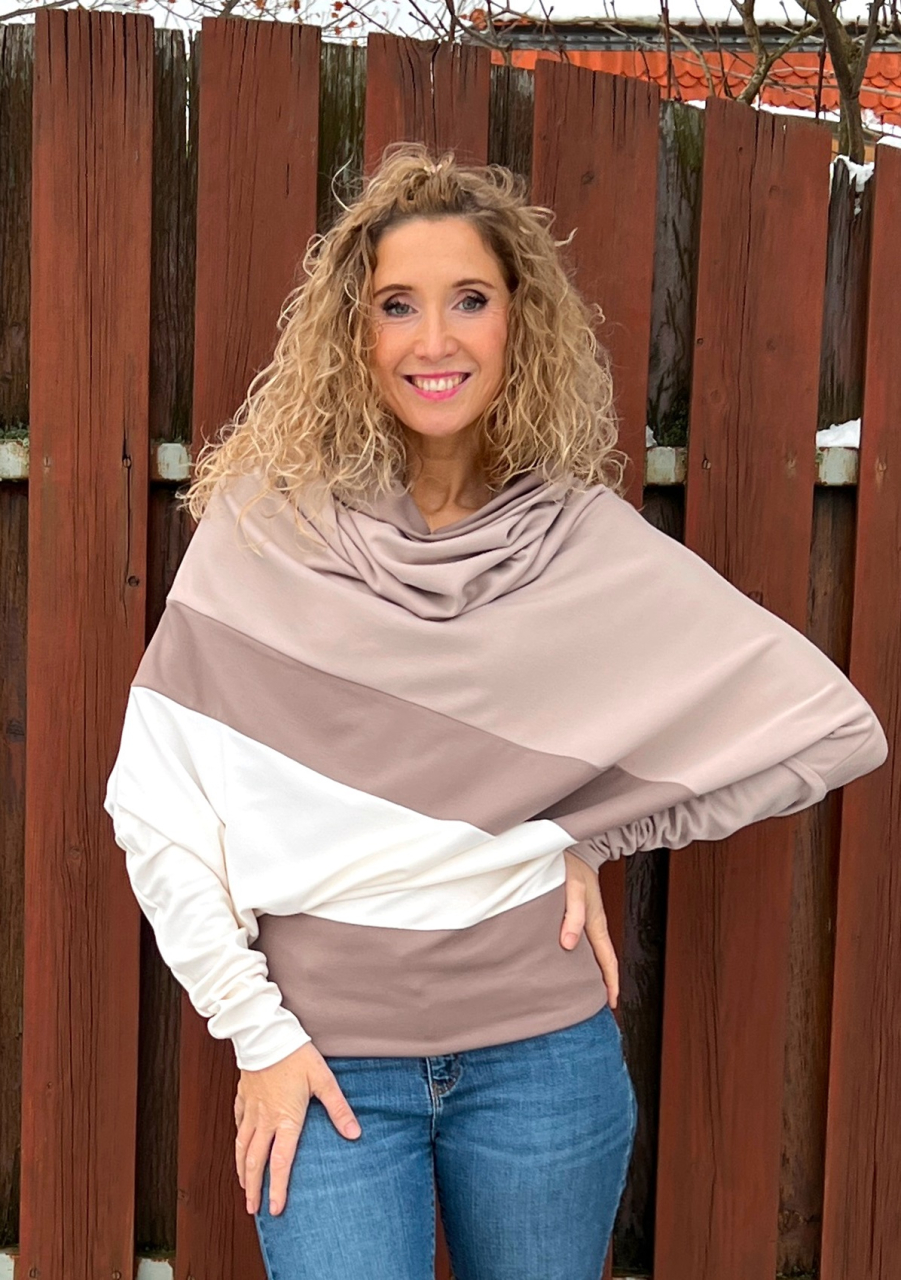 Minišaty  se otočením vzhůru nohama promění ve volnou tuniku s velkým rolákem. Šaty jsou ušité ze směsového úpletu vis/pes/el.