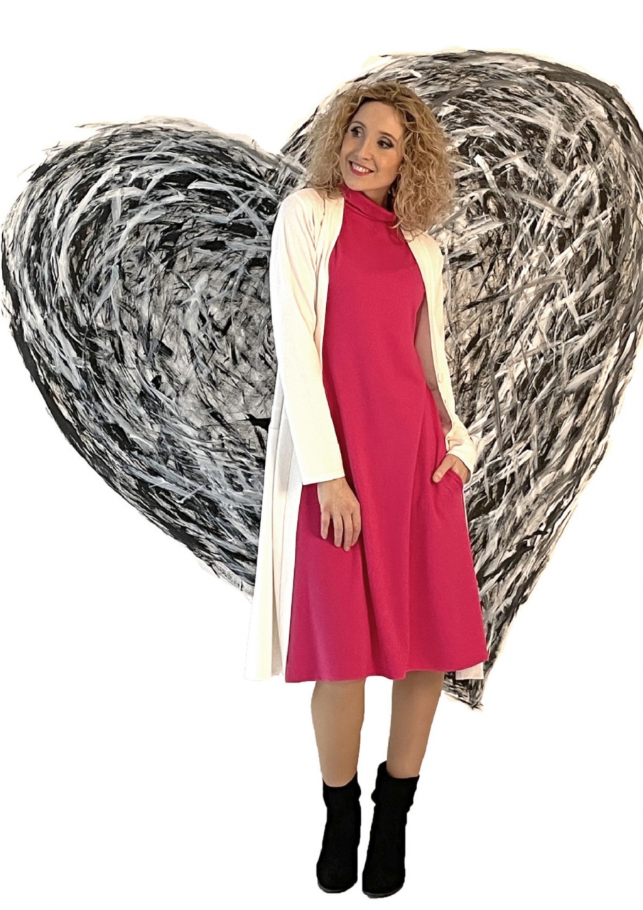 Střih je pohodlný, sukně je rozšířená do zvonu. V bočních švech jsou kapsy.