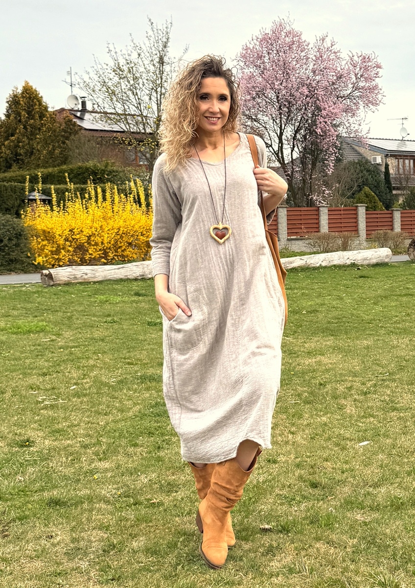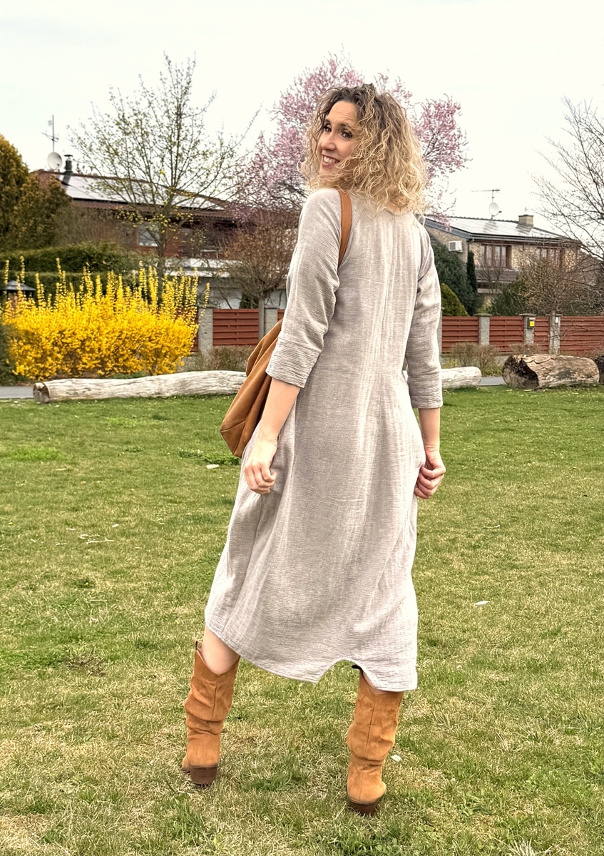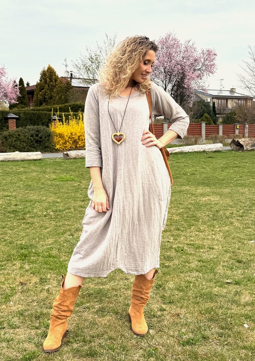 Pohodlné šaty z bavlněného mušelínu. Šaty s krátkým rukávem mají balónový střih a velké kapsy.