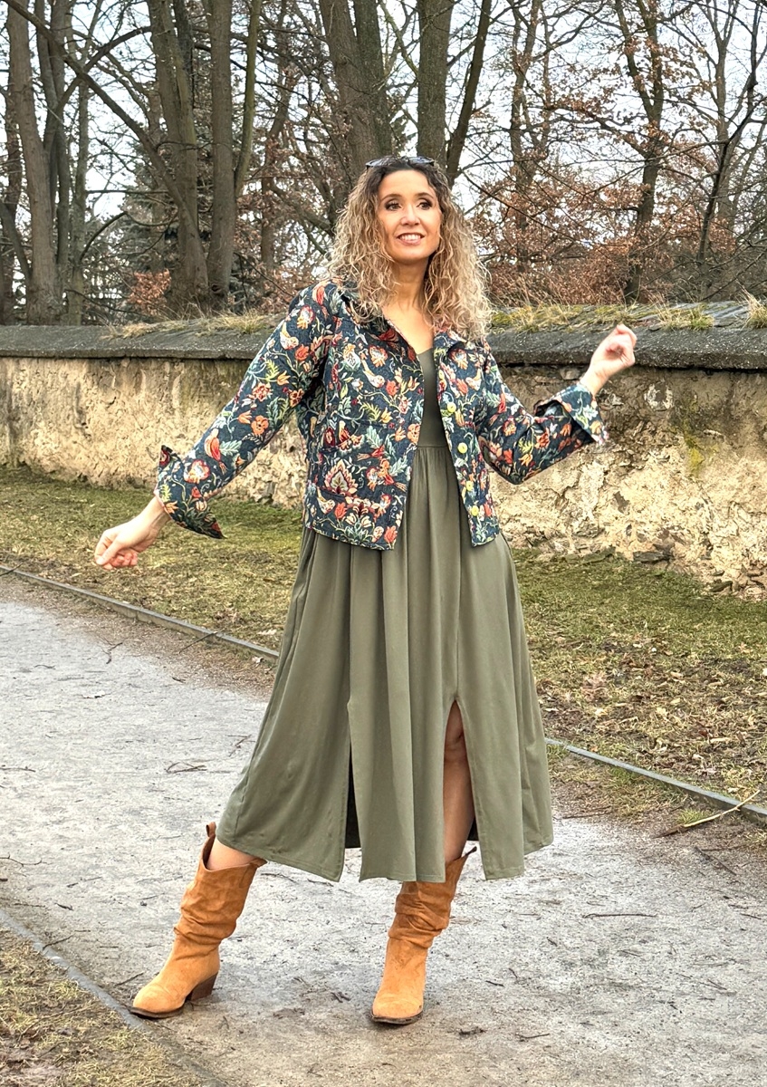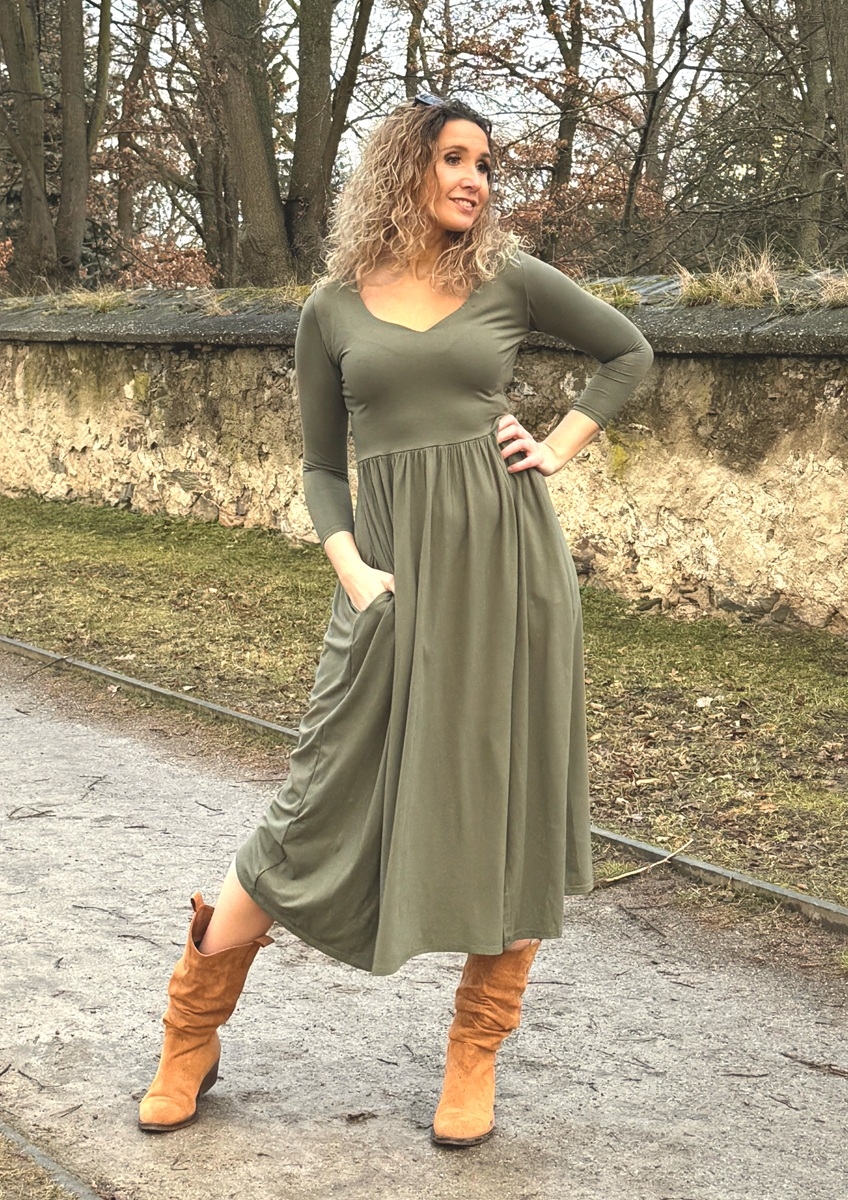 Šaty jsou ušité z úpletu viskóza/elastan. Mají dlouhou rozevlátou sukni a dva rozparky.  Výstřih do tvaru srdce. V horní části jsou přiléhavé a pod prsy se rozvoňují do široké sukně sukně s nepravidelnou délkou.
