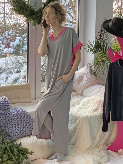 Pohodlné šaty z žebrového úpletu viskóza/elastan.   Na bocích jsou kapsy. Sukně je vykrojená do oblouku. Na zadním díle je sedlo a sukně má uprostřed zad sklad.