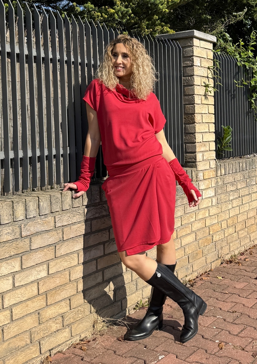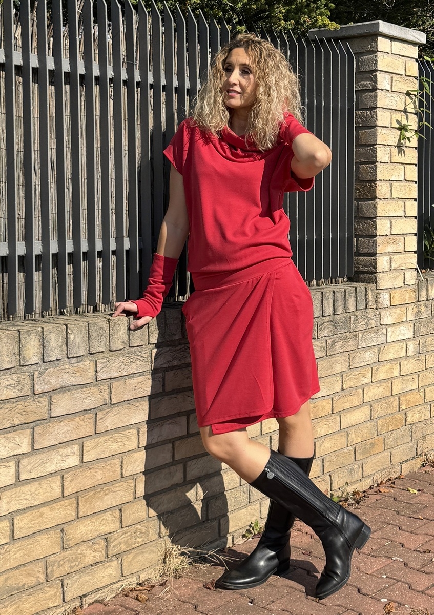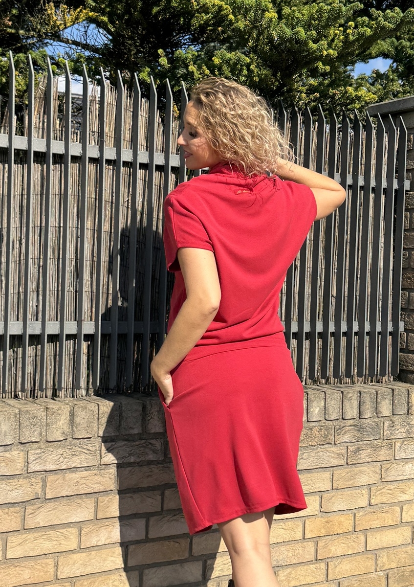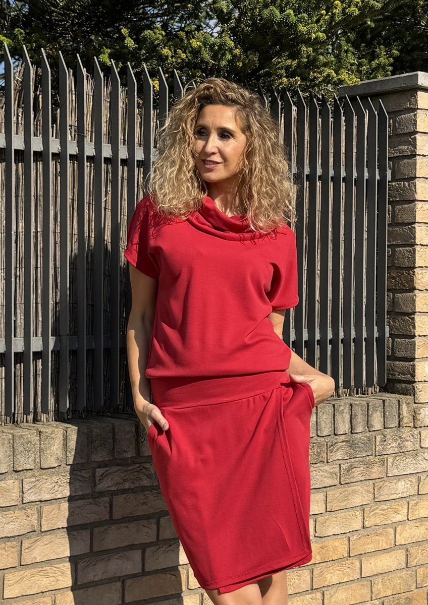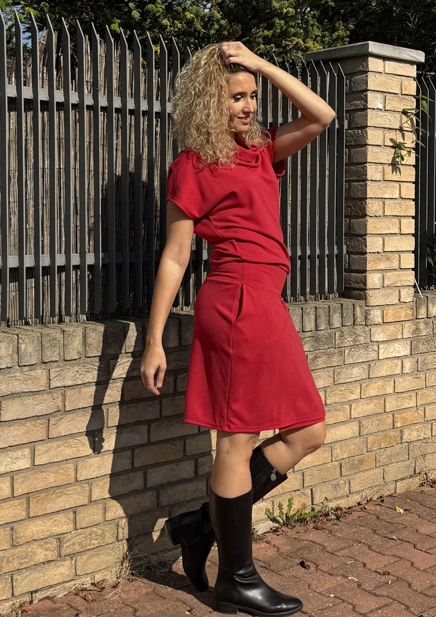 Šaty mají navolněný roláček,Sukně je zavinutá a všitá do pružného pásku. V bočních švech jsou kapsy.