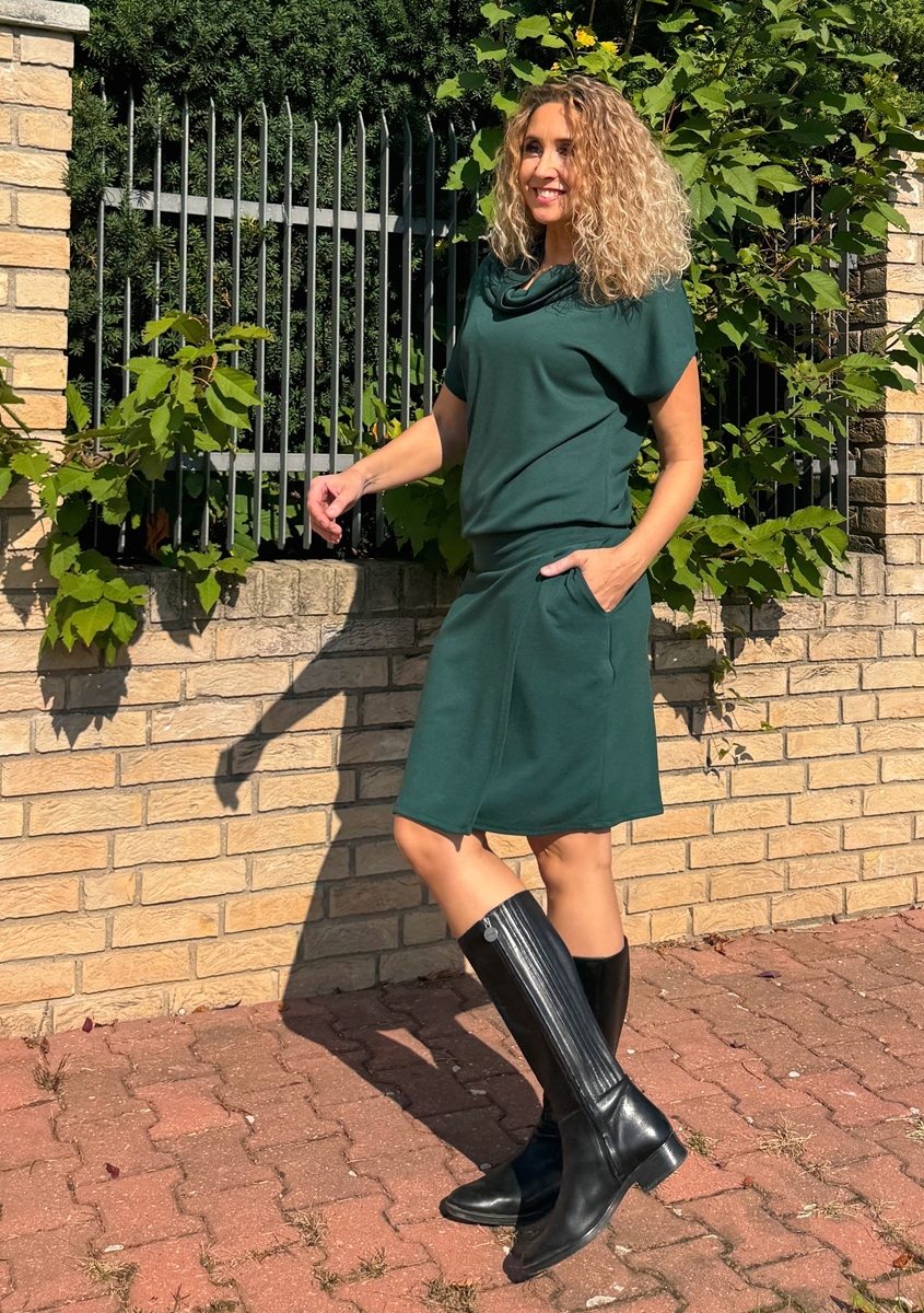 Šaty mají navolněný roláček,Sukně je zavinutá a všitá do pružného pásku. V bočních švech jsou kapsy.
