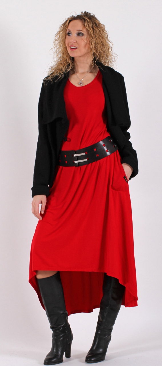 Dlouhé šaty jsou ušité z úpletu viskóza/elastan. V bocích nechybí kapsy, sukně má polokolový střih a nepravidelnou délku - mírně se svažuje dozadu.