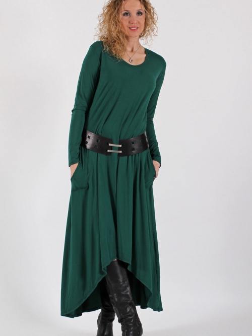 Dlouhé šaty jsou ušité z úpletu viskóza/elastan. V bocích nechybí kapsy, sukně má polokolový střih a nepravidelnou délku - mírně se svažuje dozadu.