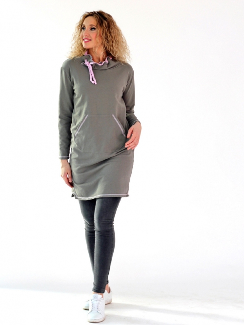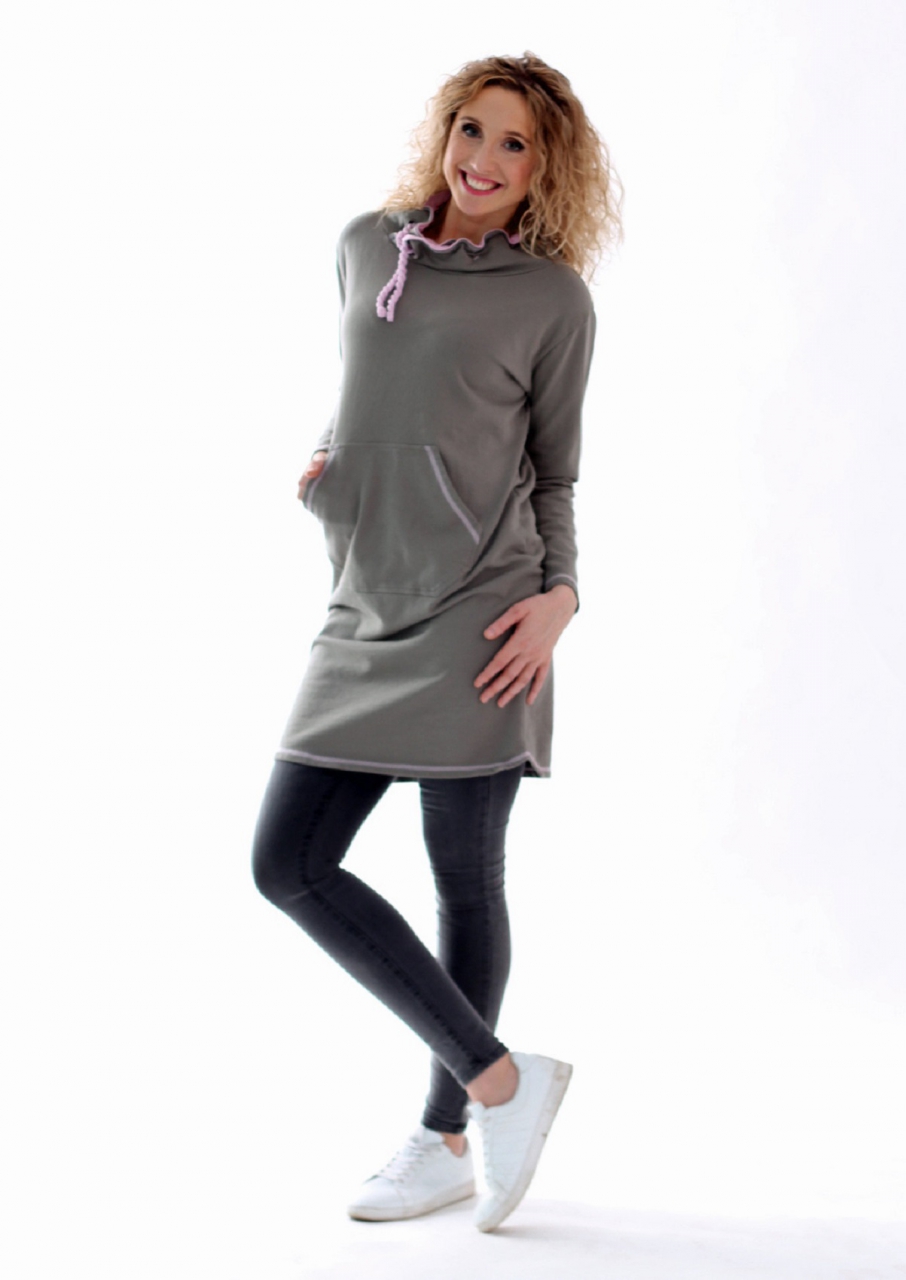 Pohodlné šaty z bavlněné teplákoviny.  Jsou mírně projmuté, Zavinovací stojáček má růžovou podšívku. Švy a lemy jsou výrazně prošívané.