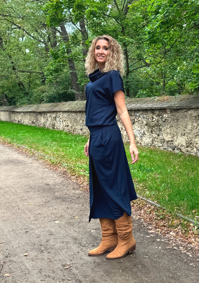 Šaty mají navolněný roláček, v bocích kapsy a přední sklad.