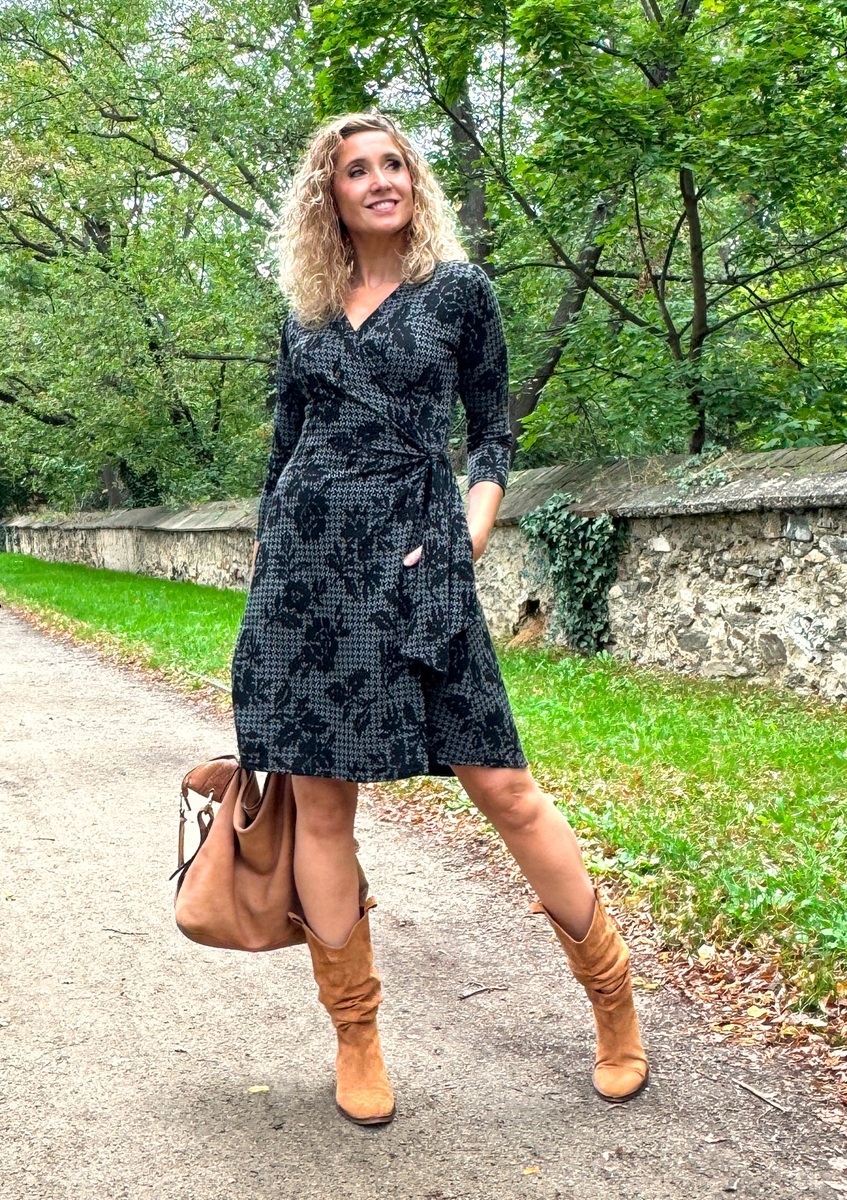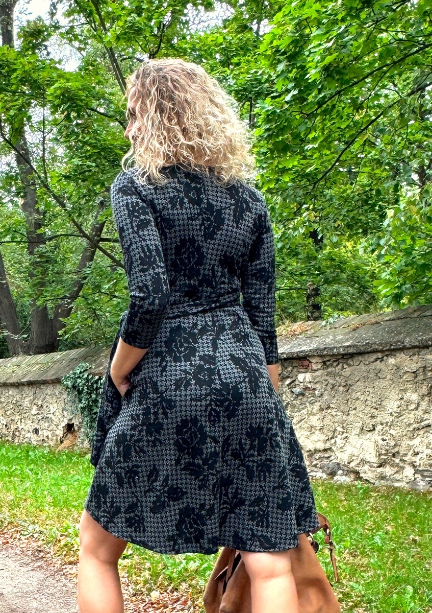 Zavinovací šaty se zvonovou sukní jsou ušité z pružného úpletu viskóza/polyester/lelastan. Na sukni jsou boční kapsy, 3/4 rukáv.