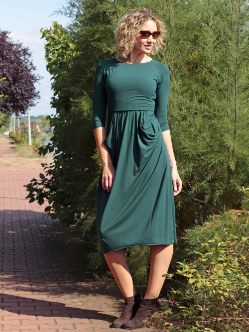 Pohodlné šaty z úpletu viskóza/elastan mají navolněné kapsy. Pas je mírně zvýšený. Sukné je balonová. Díky tomu, že lemy nejsou zakončené, ale praním zarulované, působí šaty uvolněně a ležérně.