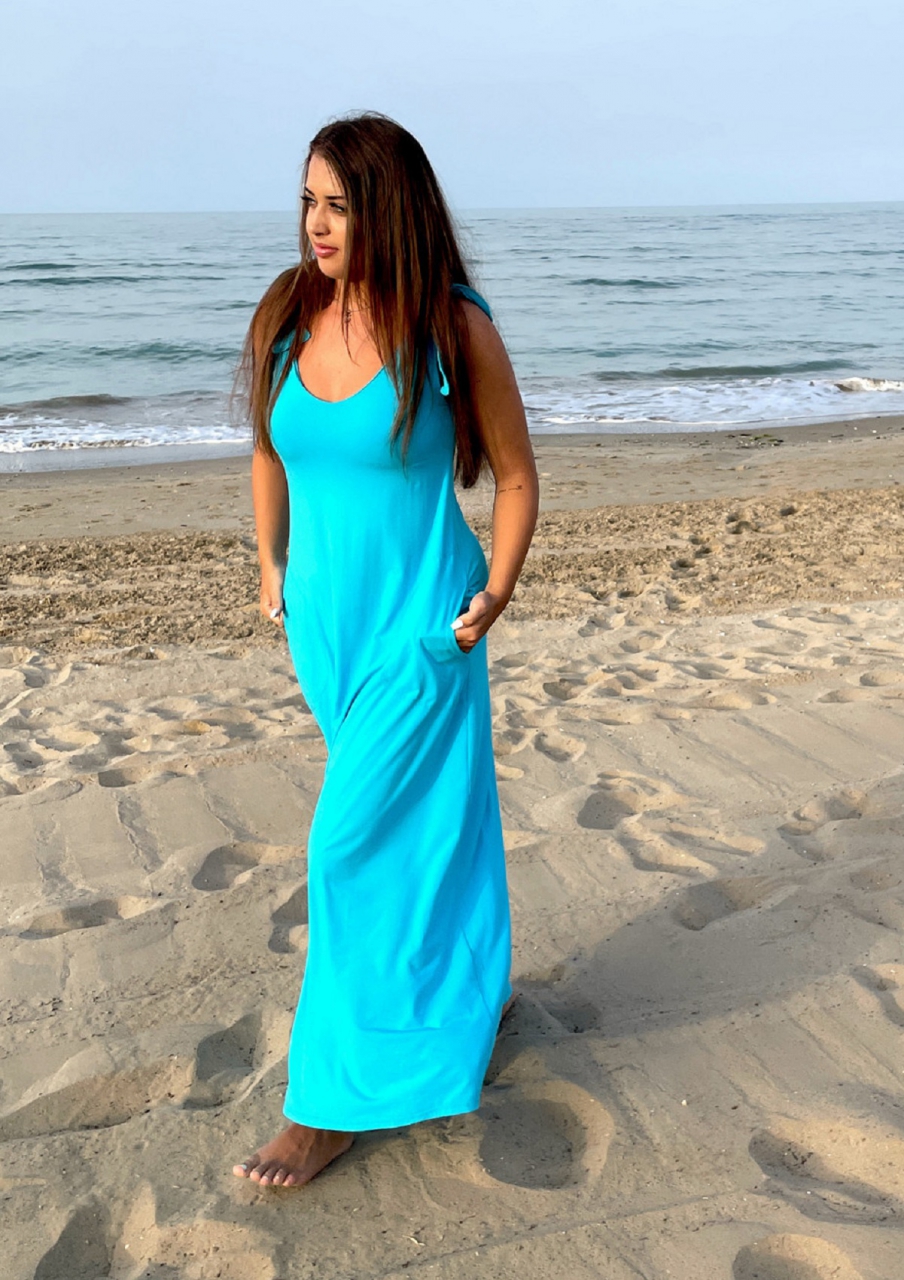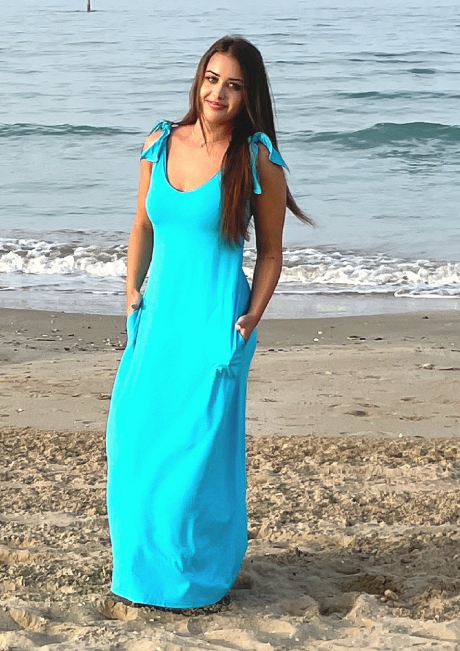 Zvonové šaty dlouhé s vázáním na ramenou tyrkysové
