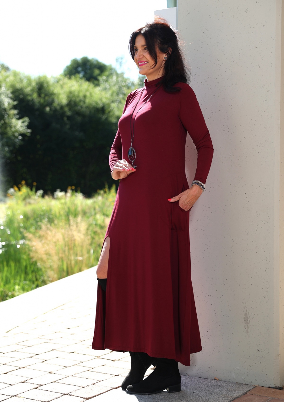 Střih je pohodlný, sukně je rozšířená do zvonu a v přední části je rozparek. Šaty mají na zádech ozdobnou slzu. V bočních švech jsou kapsy.