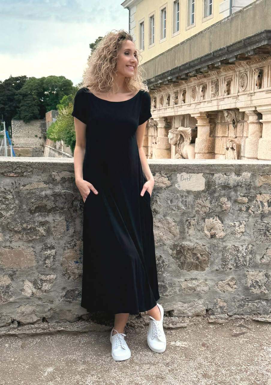Pohodlné šaty ze směsového úpletu viskóza/elastan. Zvonové šaty s krátkým rukávem mají lodičkový výstřih, vzadu je výstřih hlubší a upravovat se může vázáním.