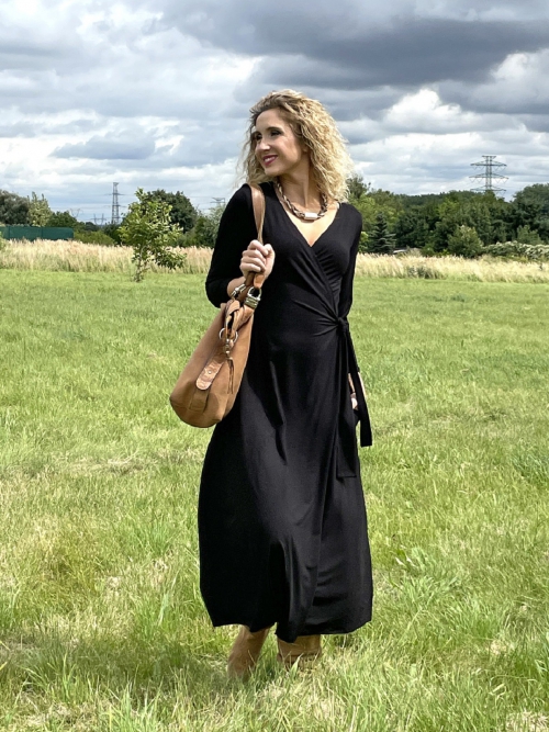Zavinovací šaty se zvonovou sukní jsou ušité z pružného splývavého úpletu viskóza/elastan. Na sukni jsou boční kapsy.