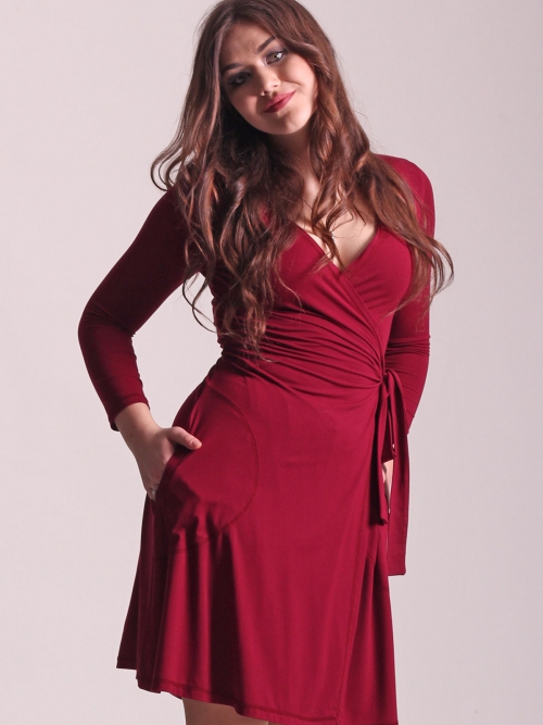 Zavinovací šaty se zvonovou sukní jsou ušité z pružného splývavého úpletu viskóza/elastan. Na sukni jsou boční kapsy.