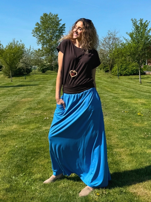 Áčková sukně je ušitá z pružného úpletu viskóza /elastan Pásek je vyztužený proti vytažení a v bočních švech jsou kapsy.