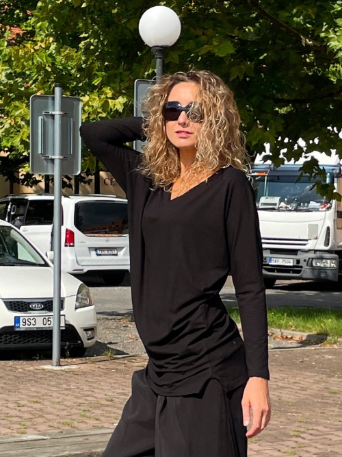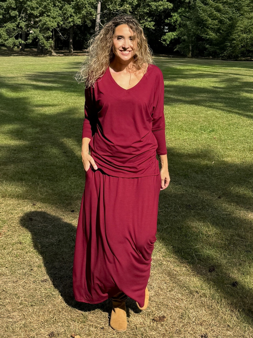 Áčková sukně je ušitá z pružného úpletu viskóza /elastan Pásek je vyztužený proti vytažení a v bočních švech jsou kapsy.