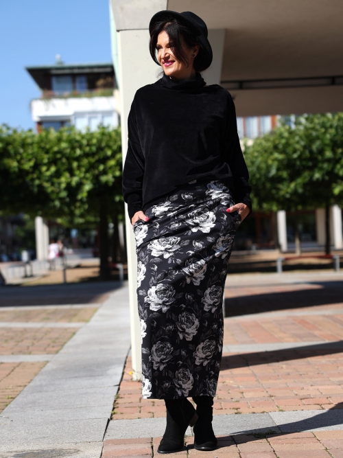 Pohodlná áčková sukně je ušitá ze silnějšího směsového úpletu vis/pes/elast.. V bocích jsou všité kapsy. Pas je pružný a pohodlný.