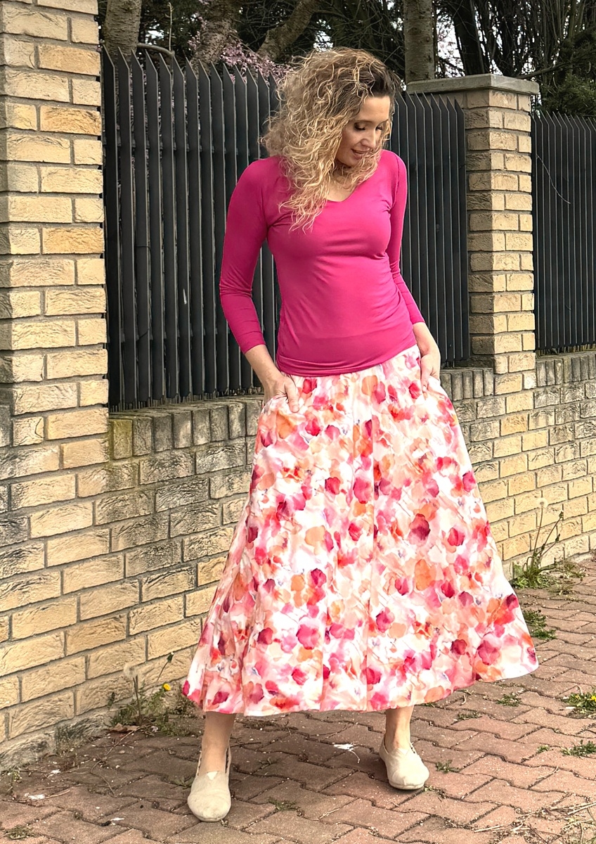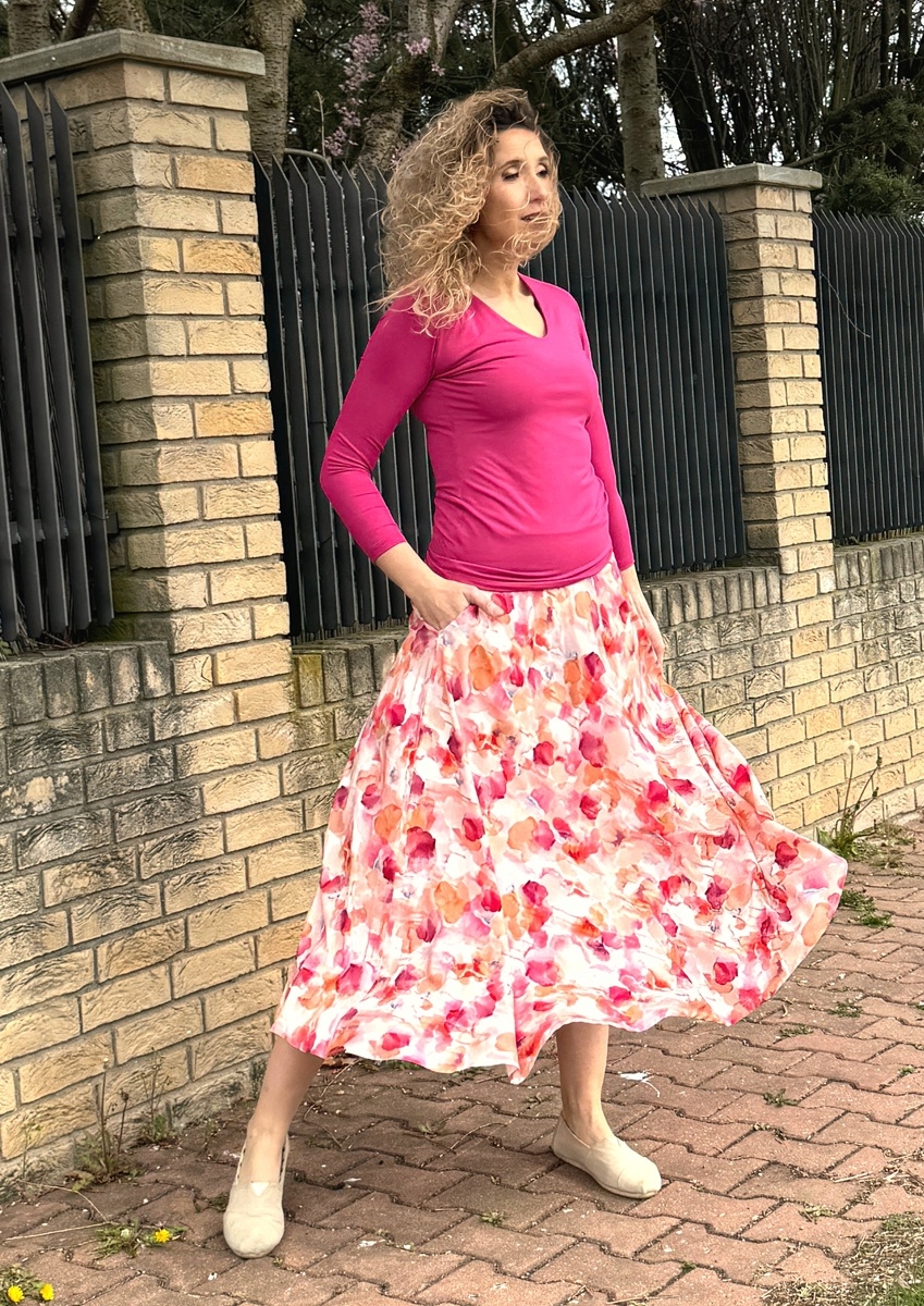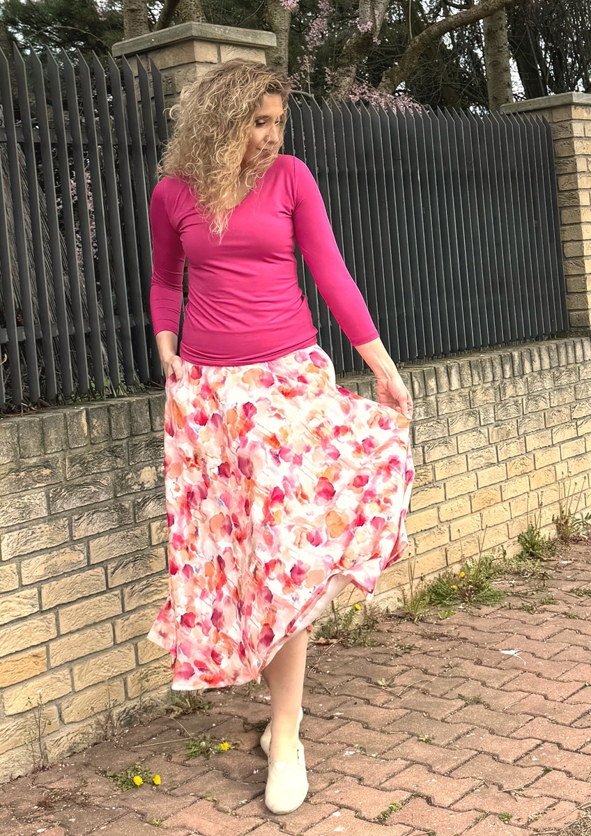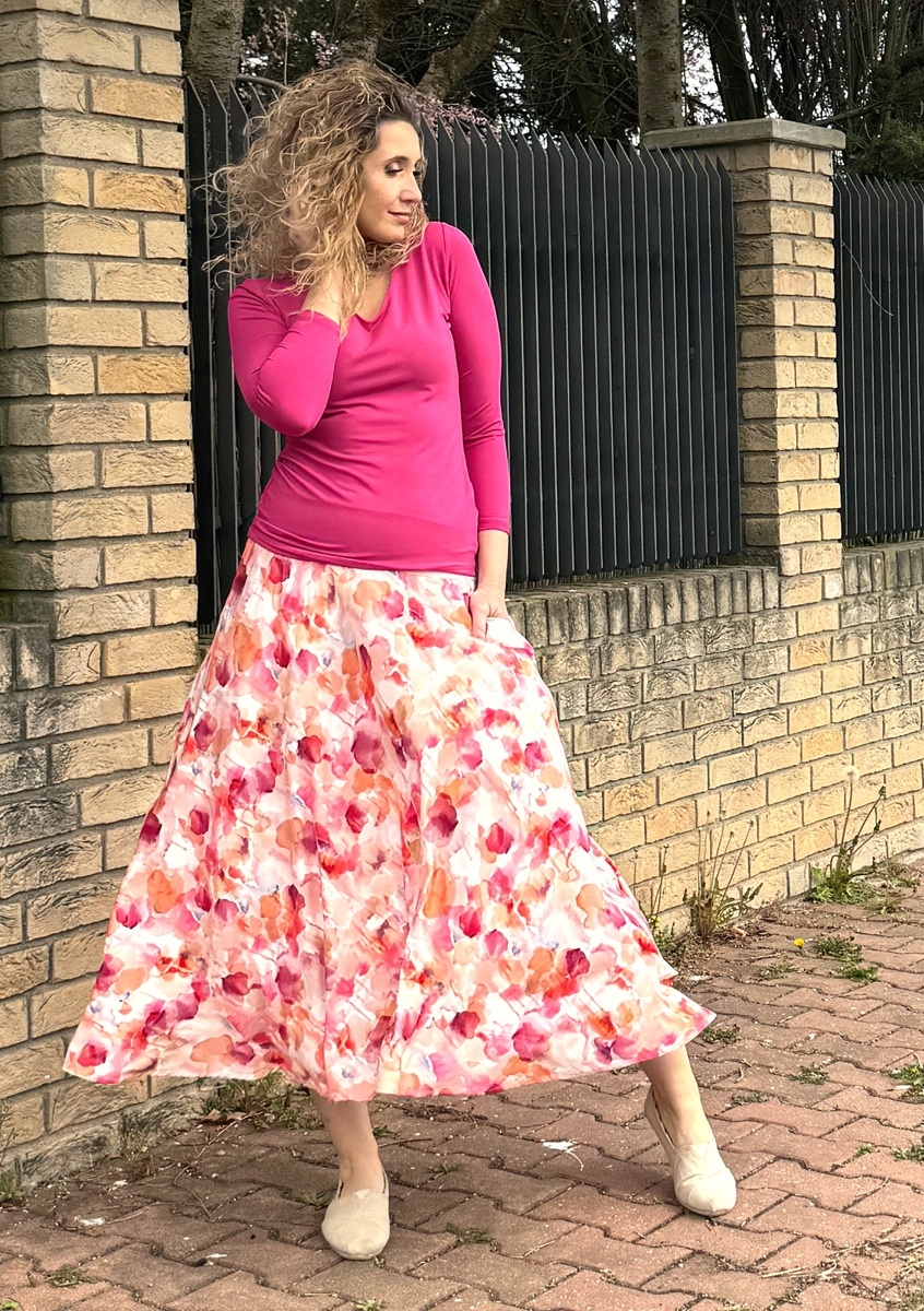 Rozšířená sukně je ušitá z lehké vzdušné 100% viskózy (96vis/4 ela) Pásek je vyztužený proti vytažení.