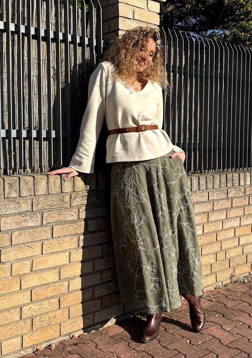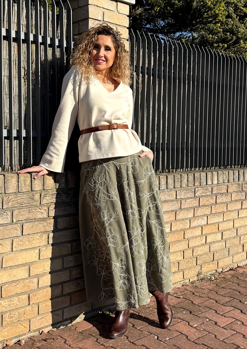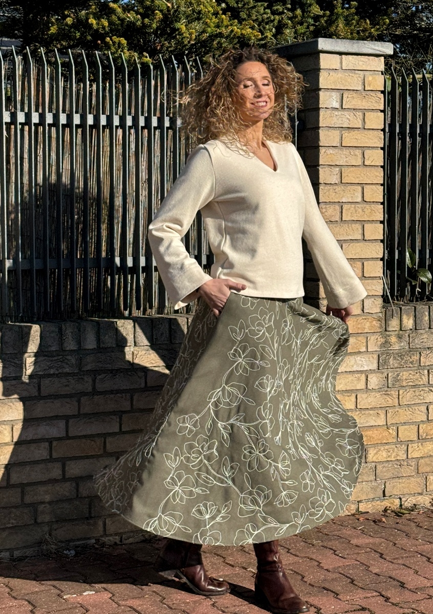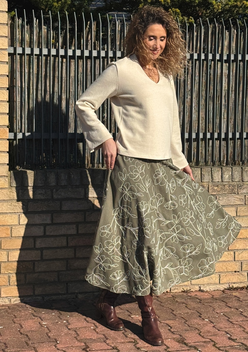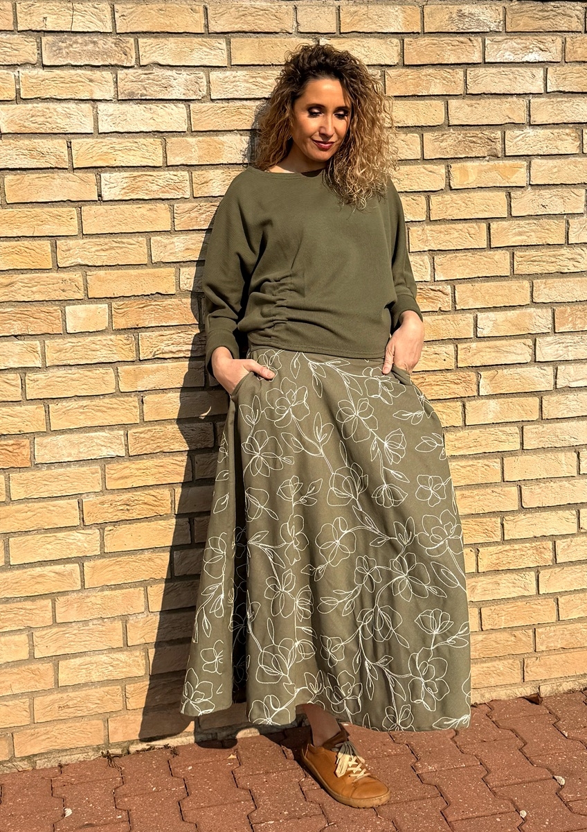 Rozšířená sukně je ušitá ze směsového materiálu (viskóza, len) s vyšívanými květy. Pásek je vyztužený proti vytažení. V bočních švech jsou kapsy.