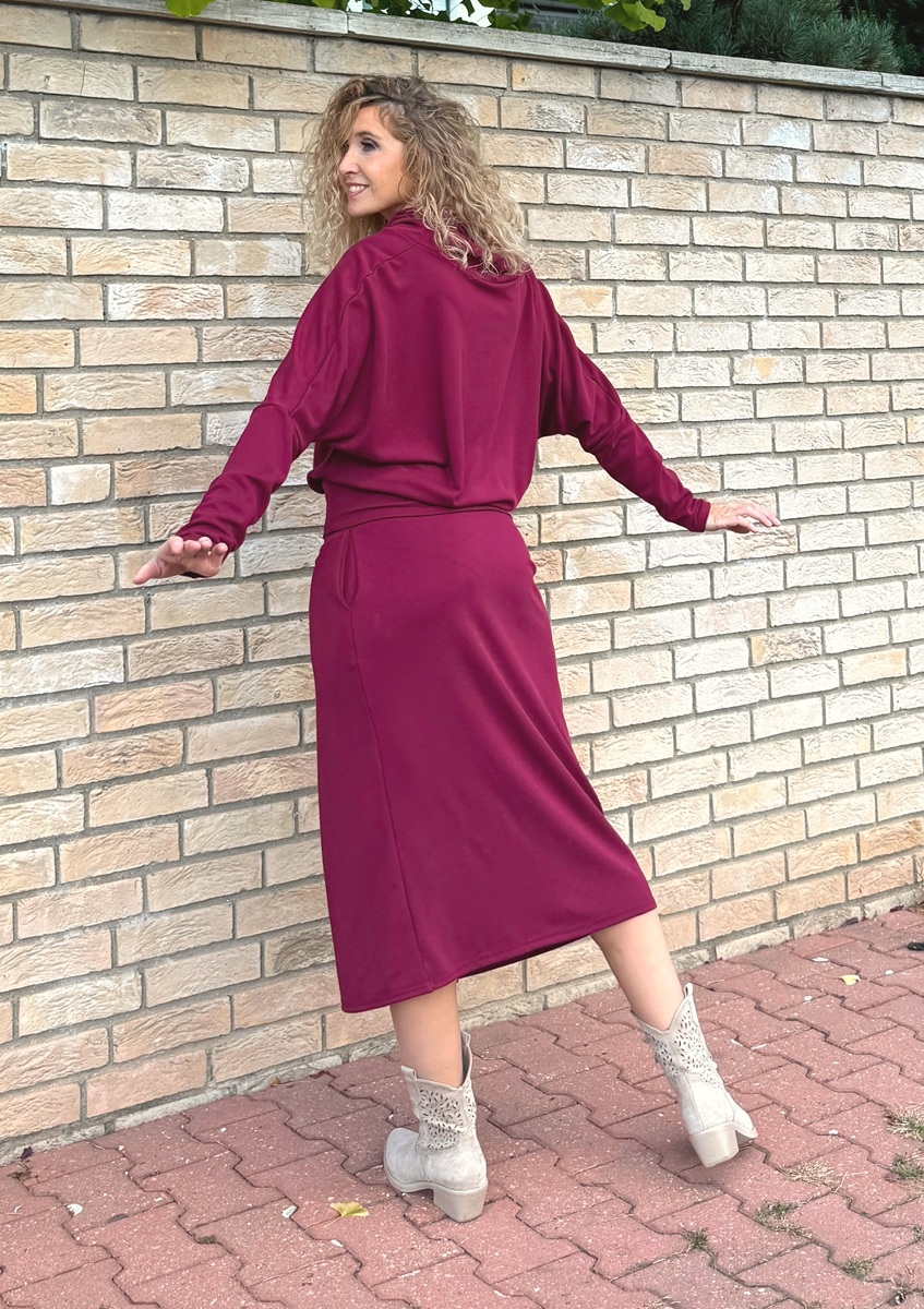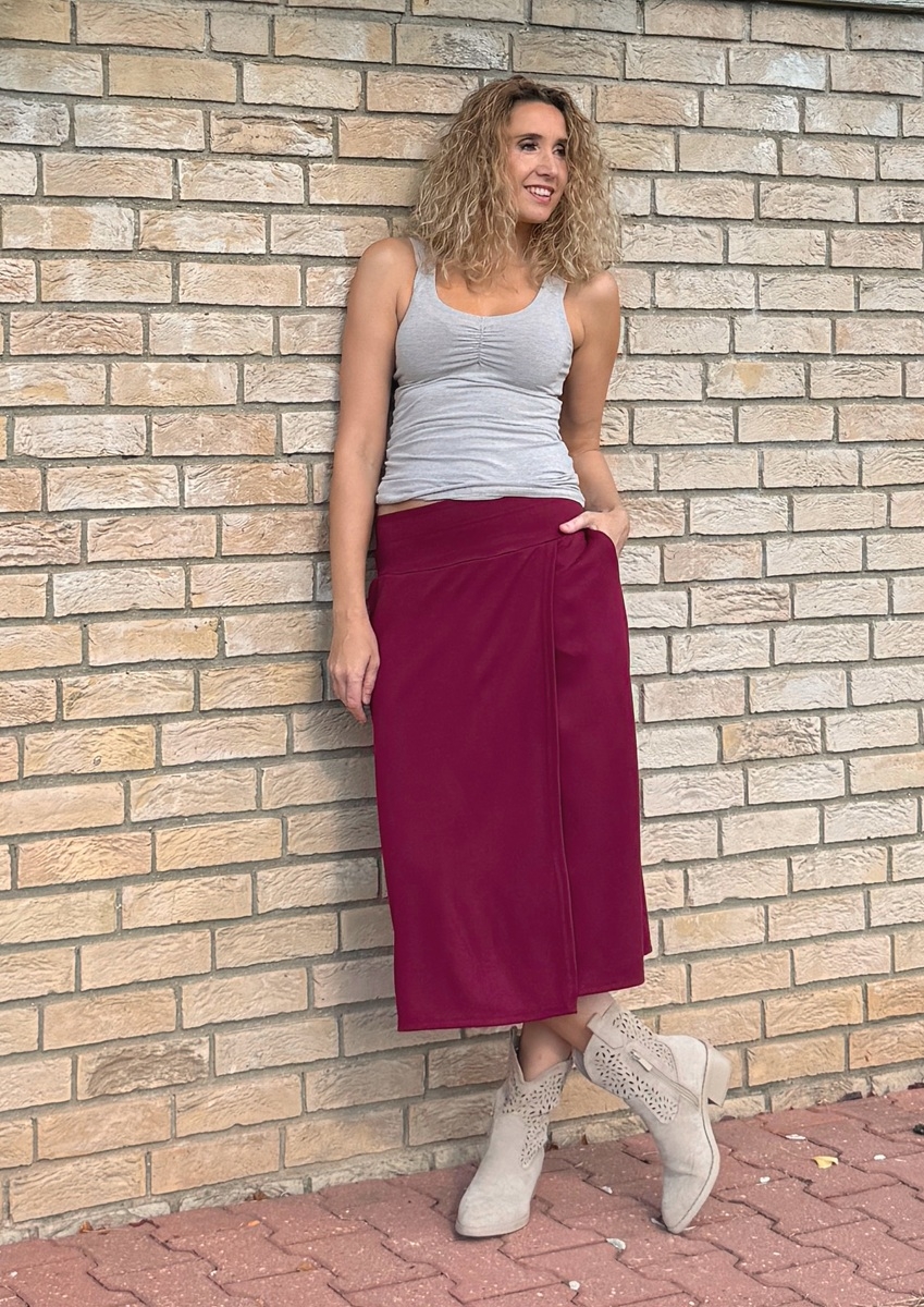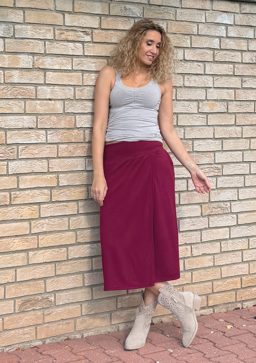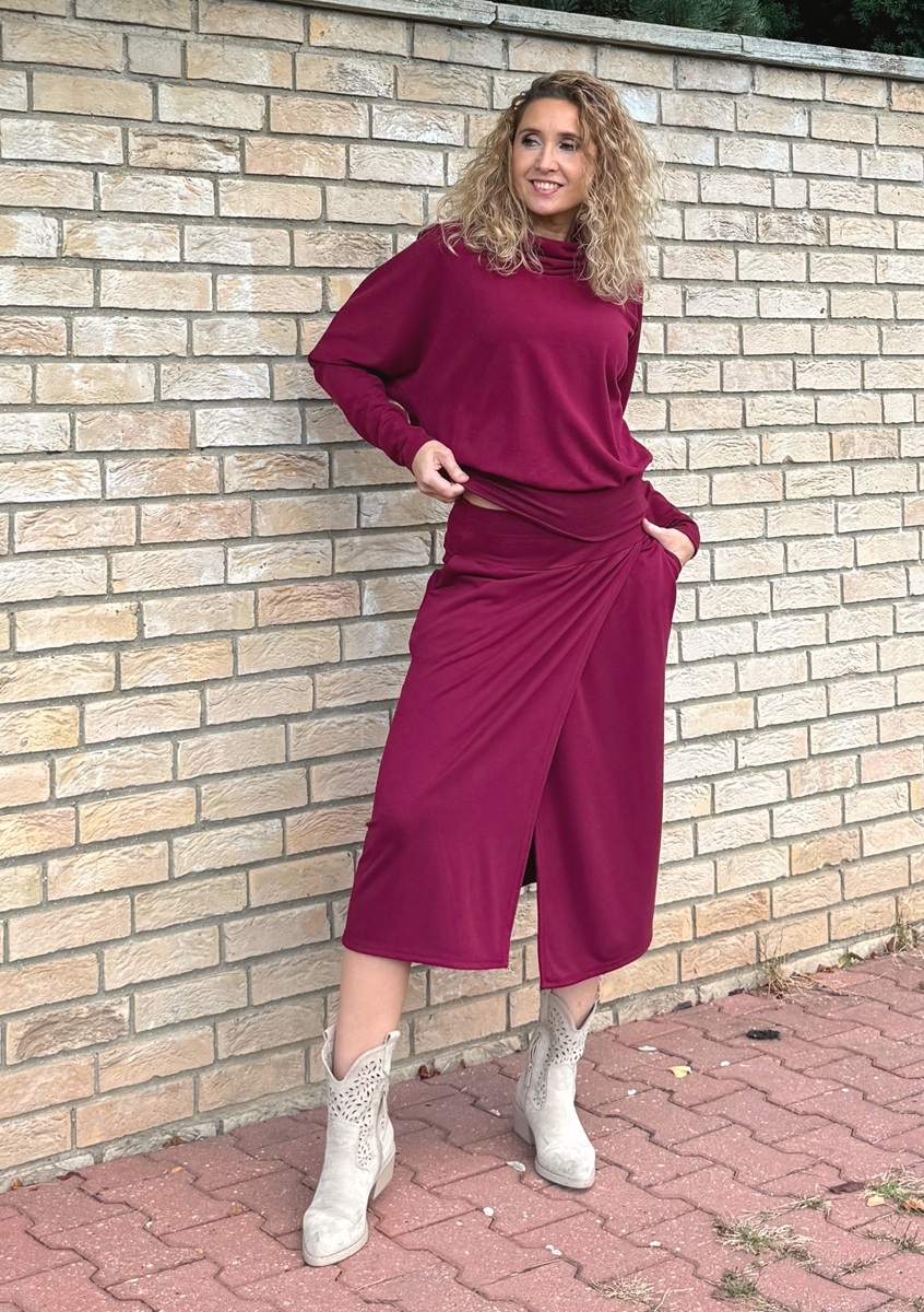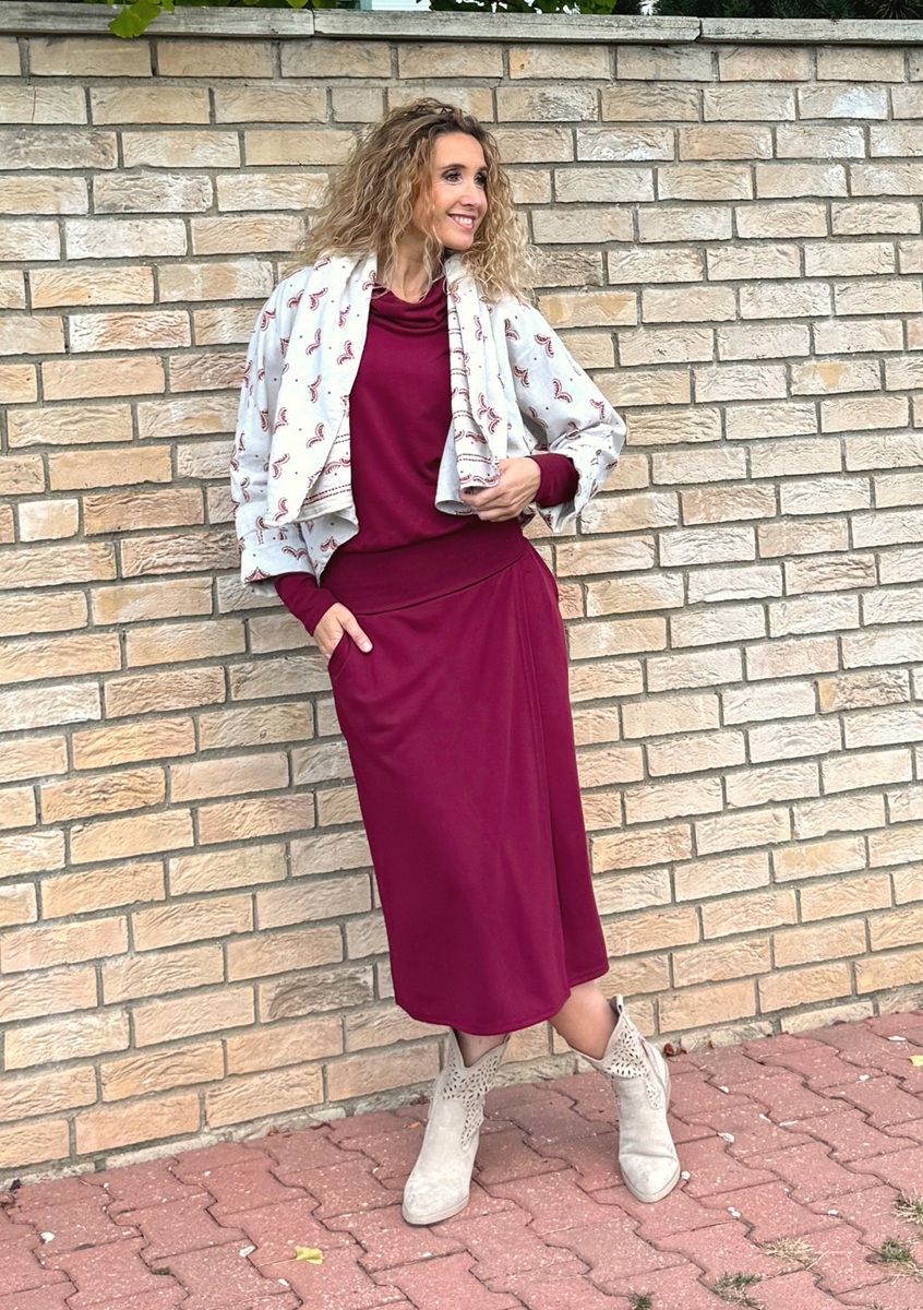 Sukně je ušitá ze směsového středně silného úpletu (68%Vis/28pes/4%ela). Pásek je pružný (vyztužený proti vytažení). Sukně je falešně zavinovací. v bocích jsou vnitřní kapsy.