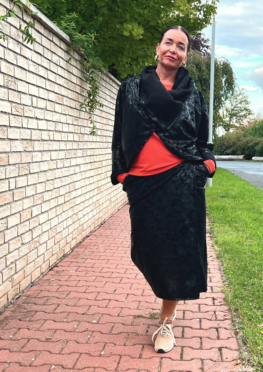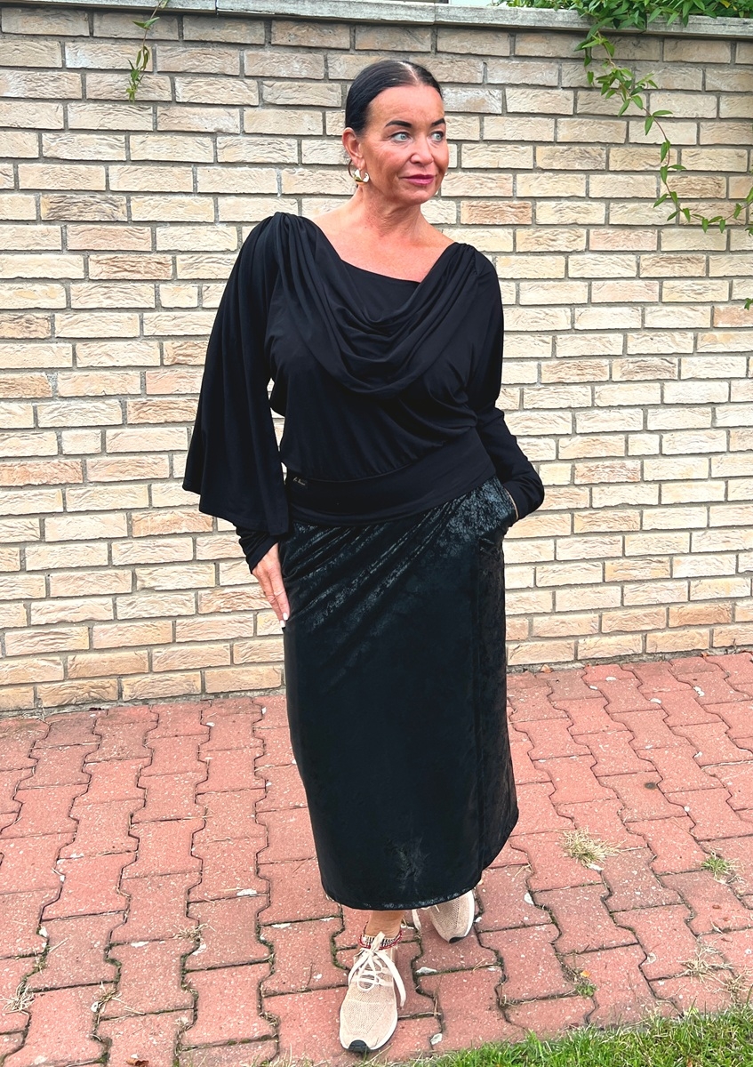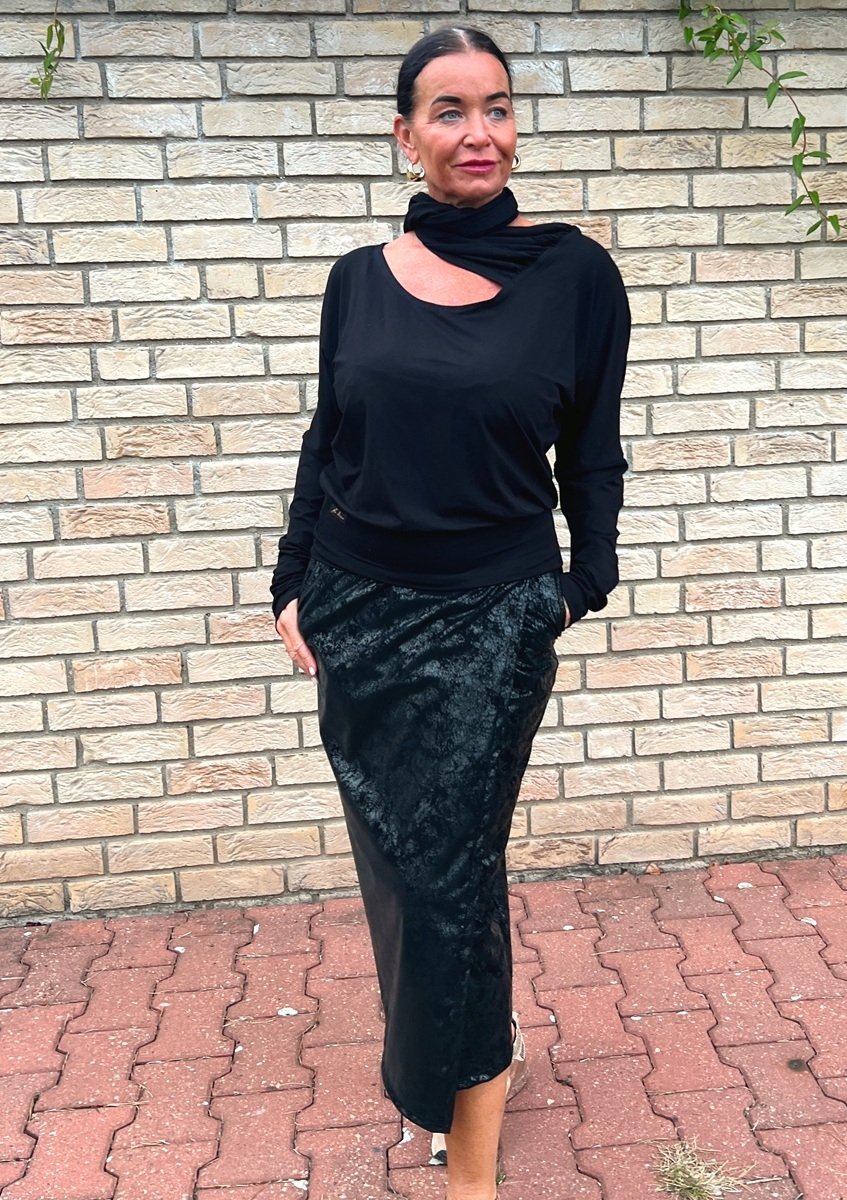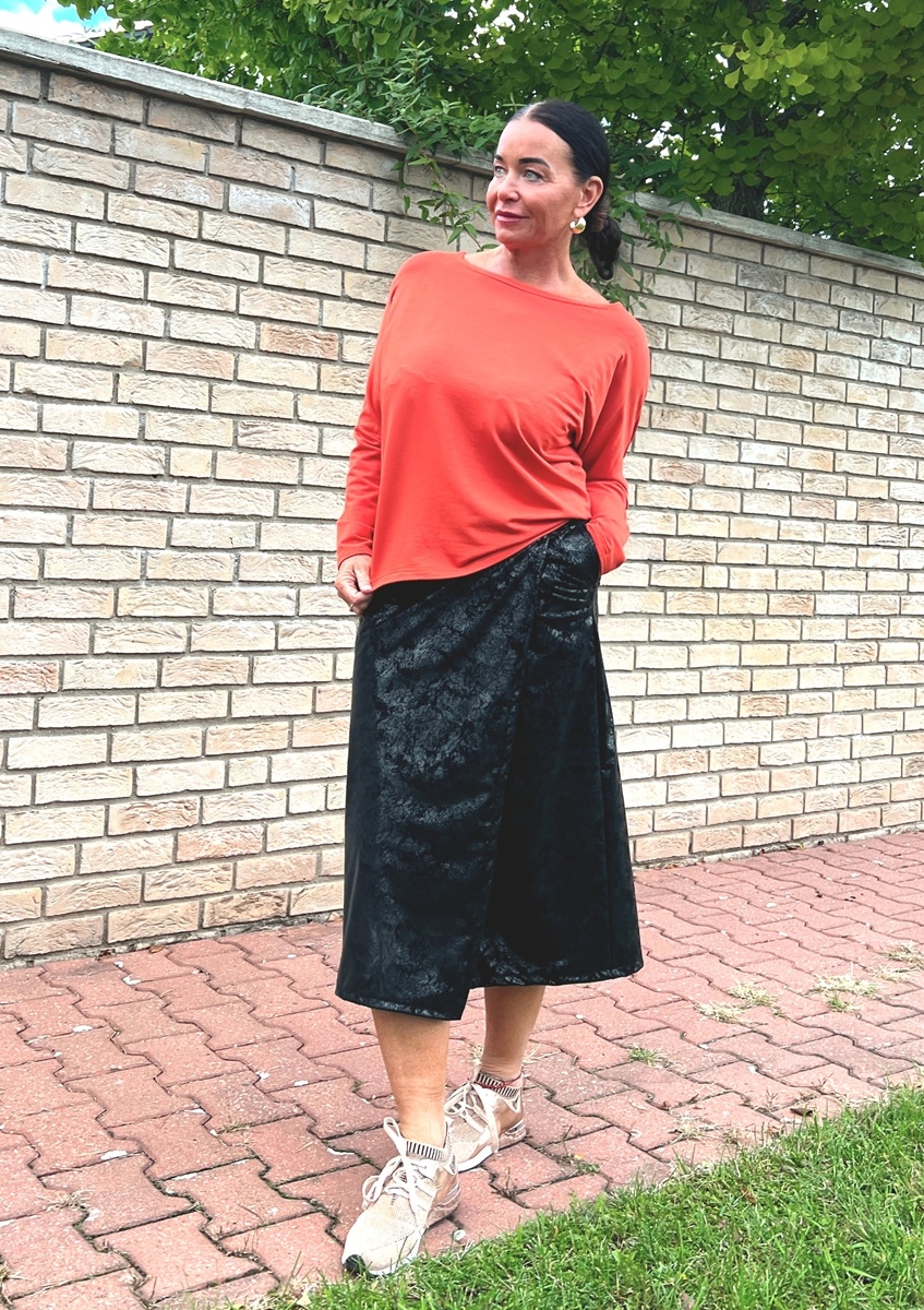 Sukně je ušitá z hřejivého materiálu, který má spodní fleesovou vrstvu a z vnější části budí koženkový efekt. Je tedy ideální i do chladných dnů. Pásek je pružný (vyztužený proti vytažení). Sukně je falešně zavinovací. v bocích jsou vnitřní kapsy.