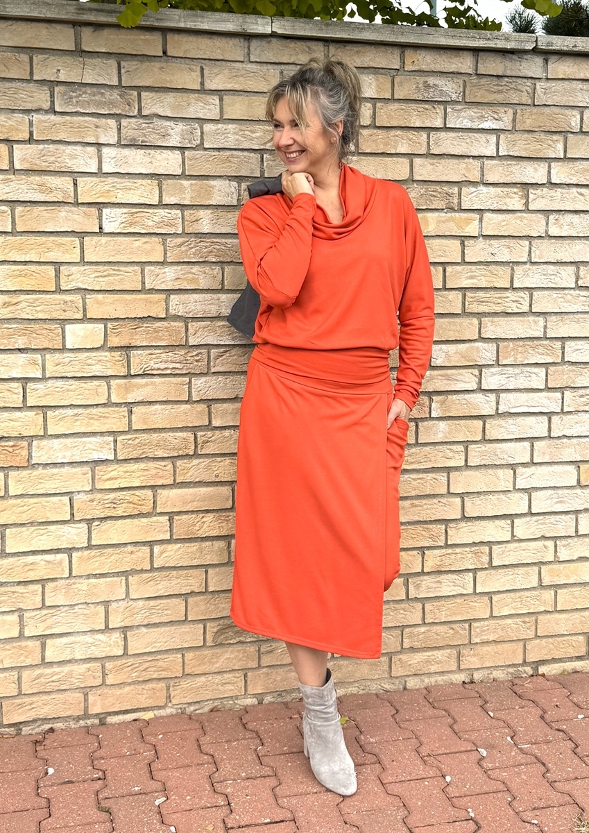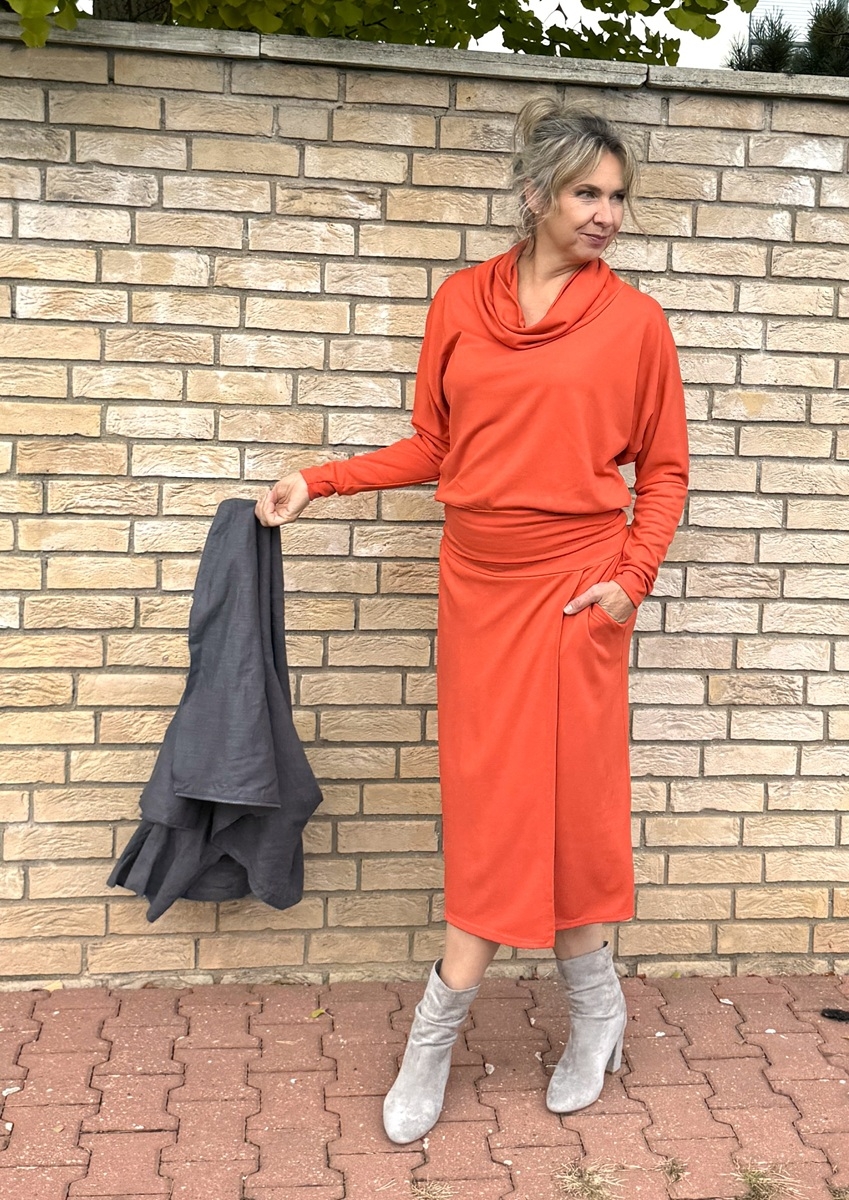 Sukně je ušitá ze směsového středně silného úpletu (68%Vis/28pes/4%ela). Pásek je pružný (vyztužený proti vytažení). Sukně je falešně zavinovací. v bocích jsou vnitřní kapsy.