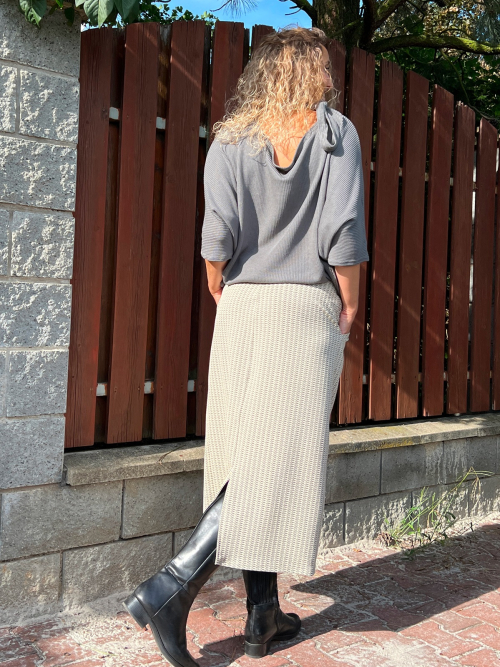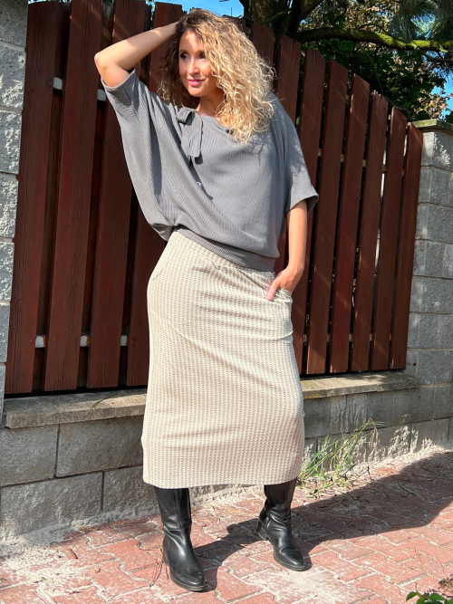 Pohodlná sukně je ušitá ze silnějšího zátěžového úpletu vis/pes/elast.. V bocích jsou všité kapsy. Sukně má vázání na šňůrku a v bocích kapsy.