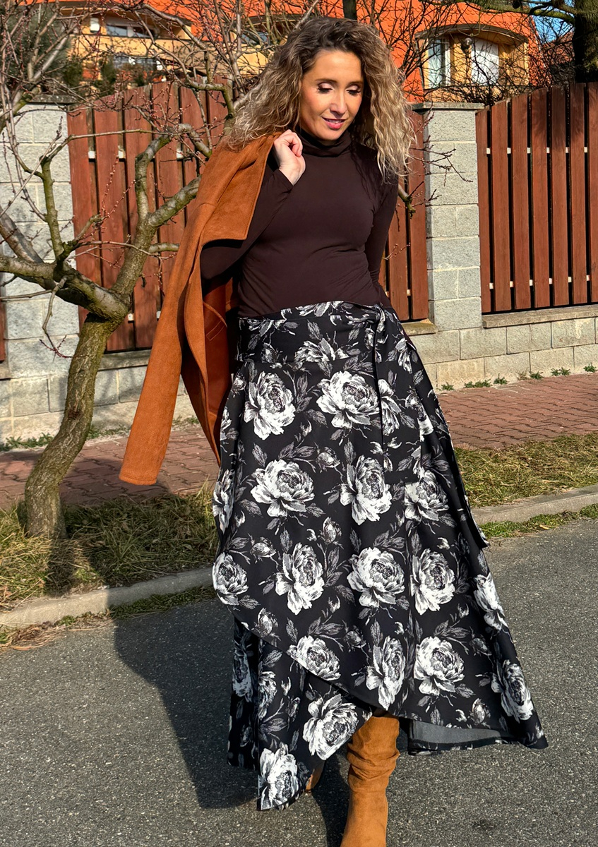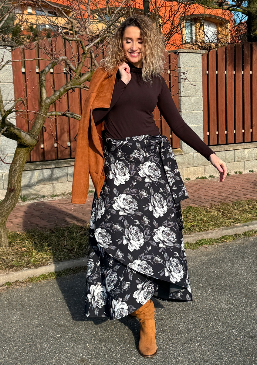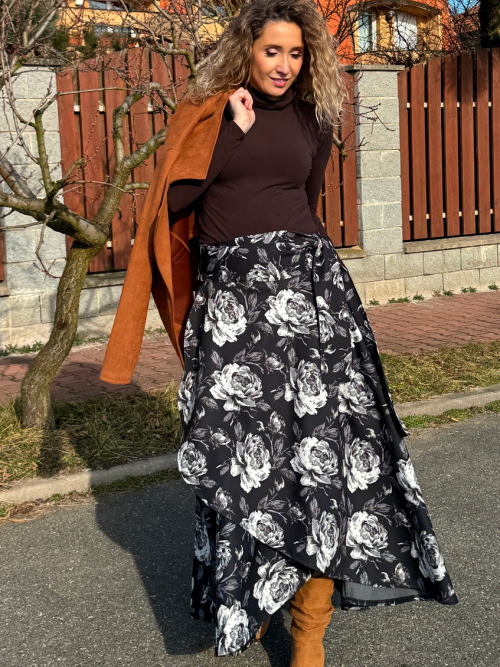 Zavinovací dlouhá sukně má v bocích jsou všité kapsy.Materiál je velmi příjemný , středně silný (68% viskóza/ 28% polyester/ 4%elastan). V pase jsou má poutka k provlečení pásku.