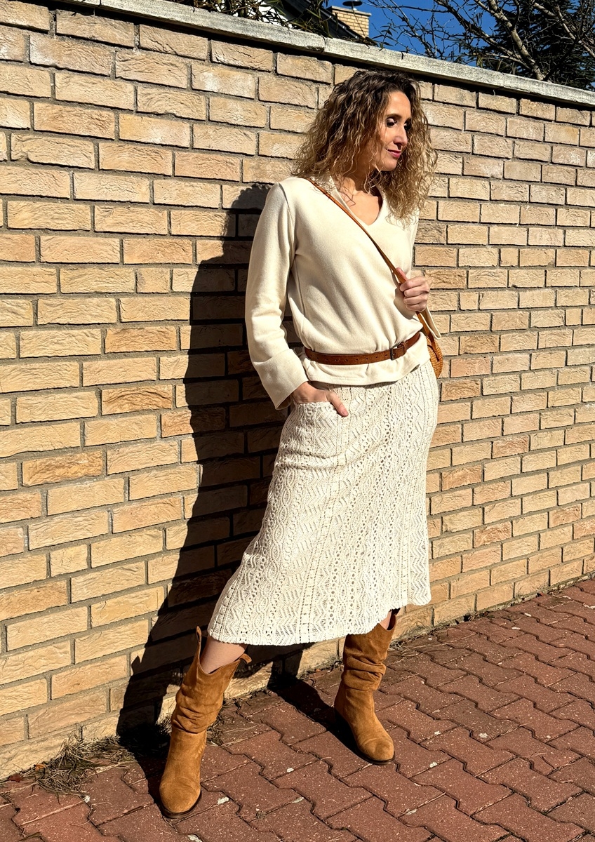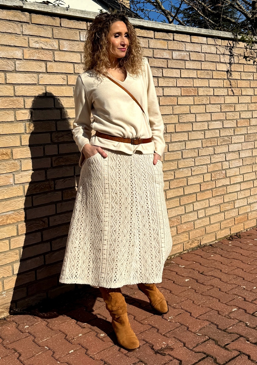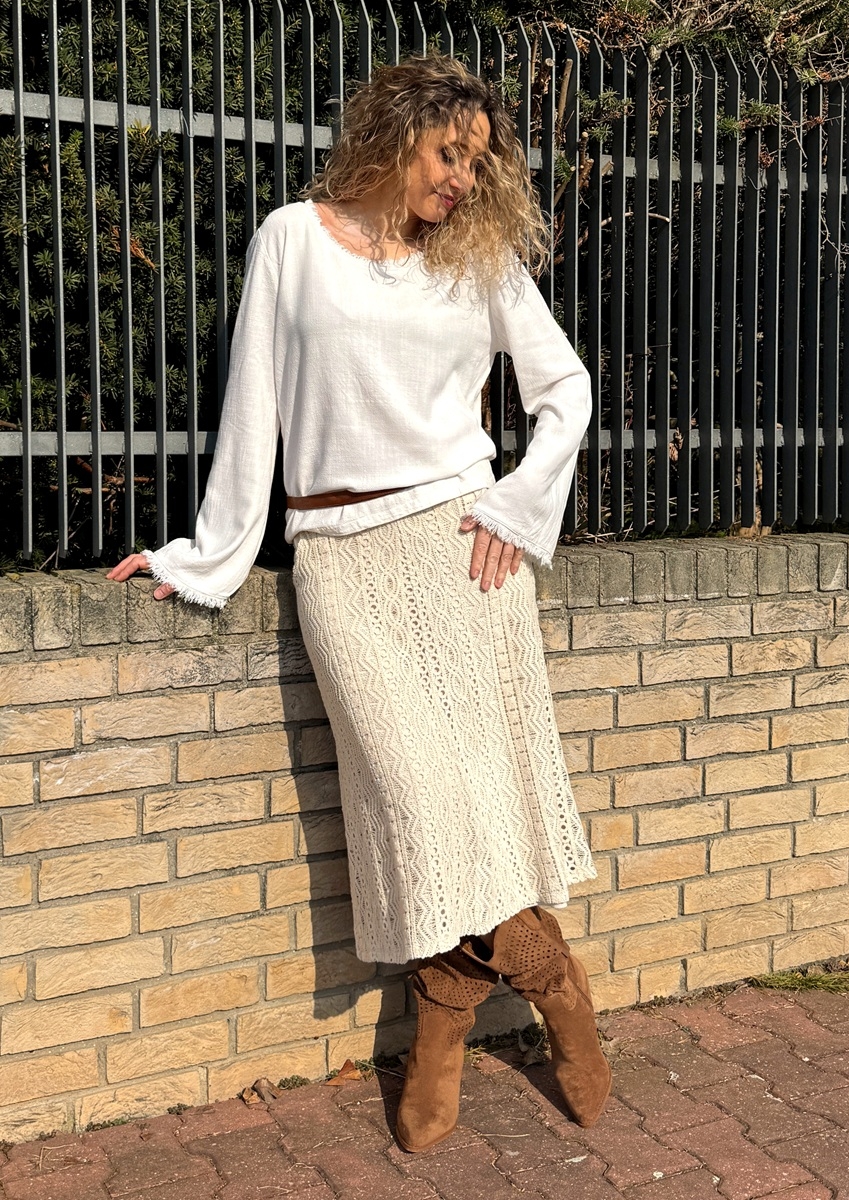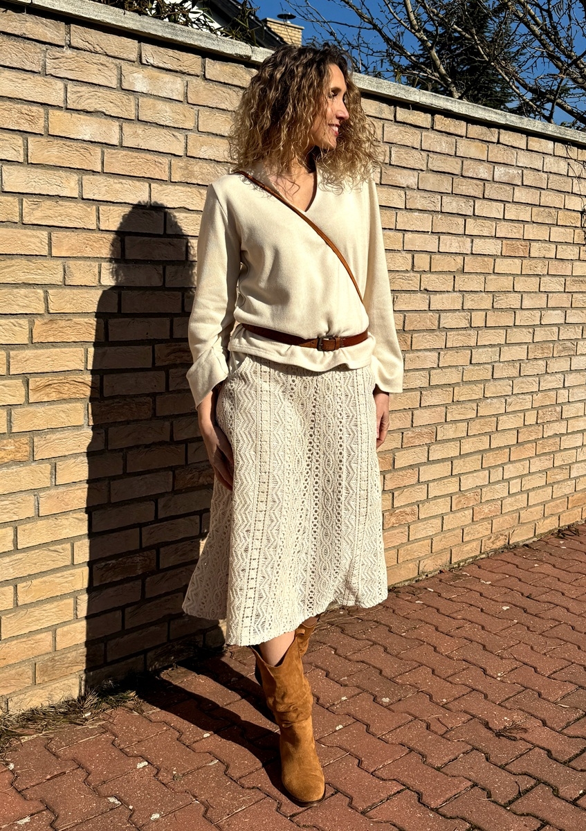 Zvonová sukně je ušitá z bavlněné krajky, podšívka je z úpletu (Vis//el). Pásek je pružný. Sukně má kapsy.