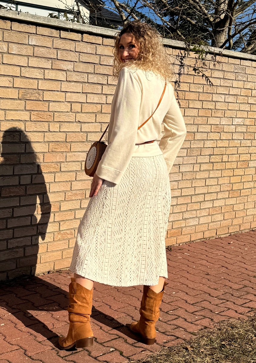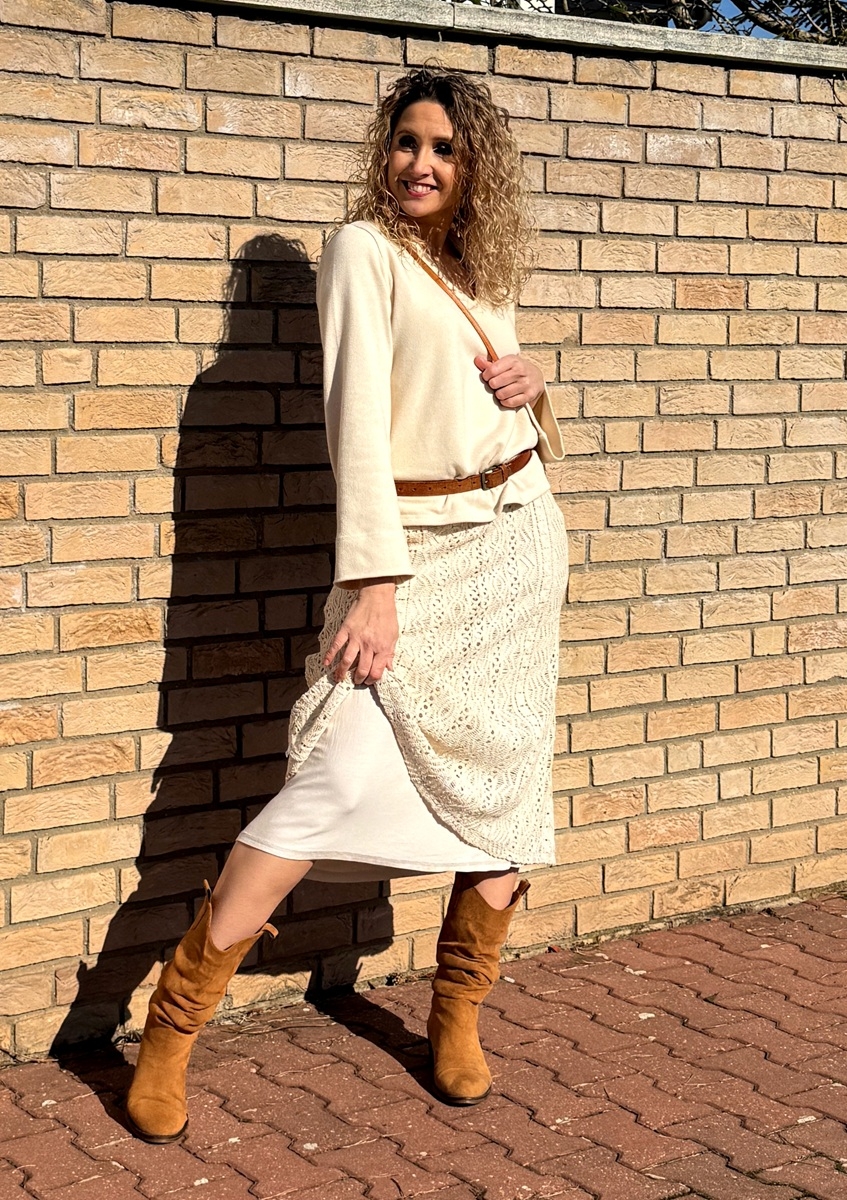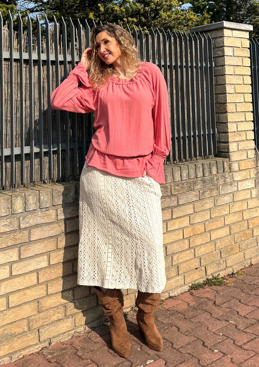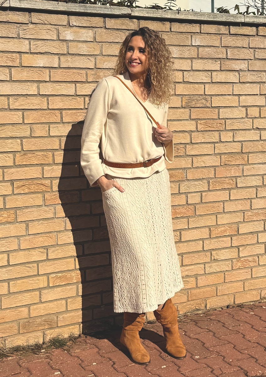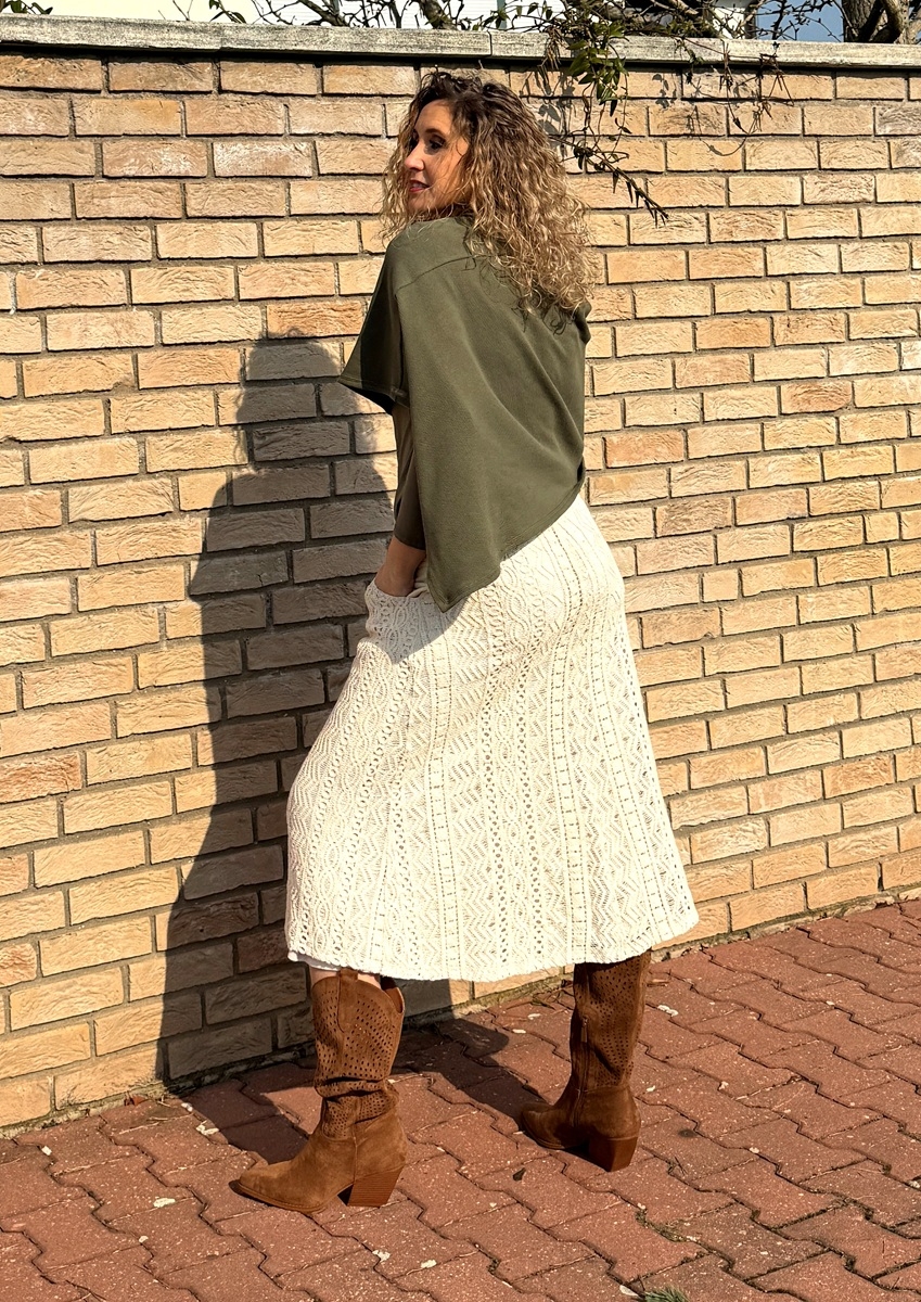 Zvonová sukně je ušitá z bavlněné krajky, podšívka je z úpletu (Vis//el). Pásek je pružný. Sukně má kapsy.