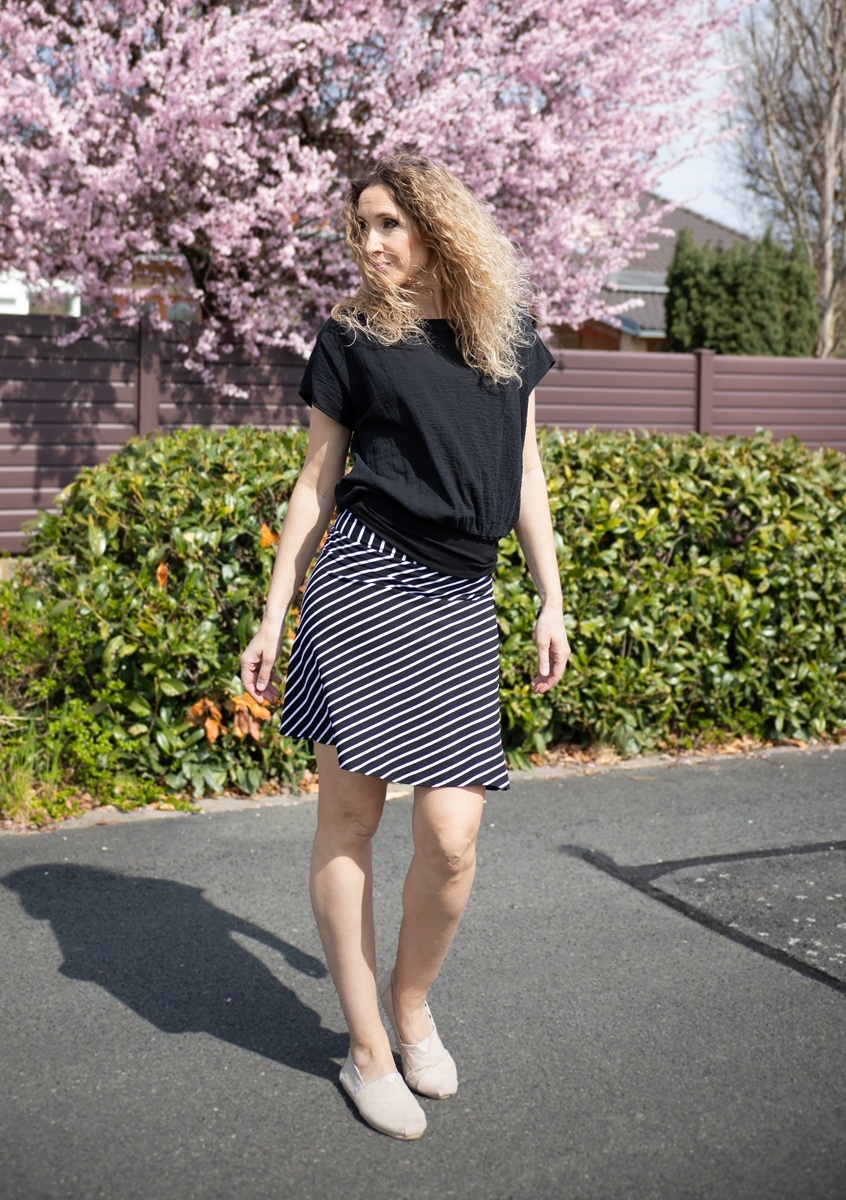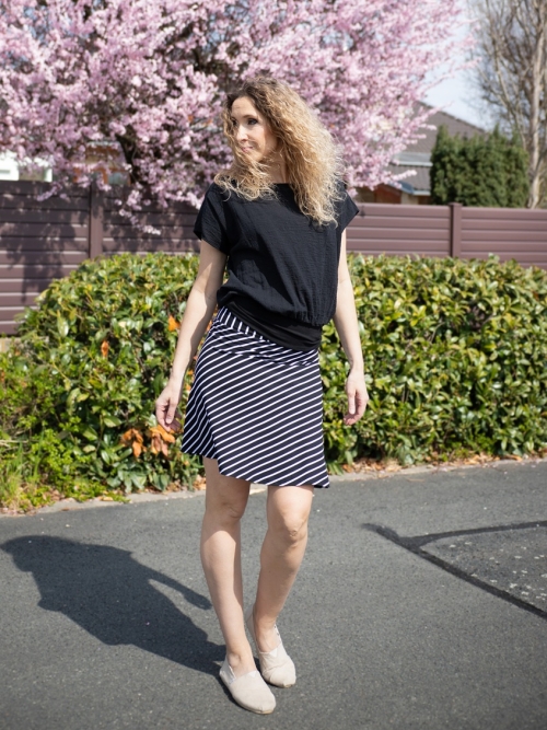 Rozšířená sukně je ušitá z pružného úpletu viskóza /elastan . Pruhy můžete polohovat kolem dokola, čímž vzniká zajímavý efekt.