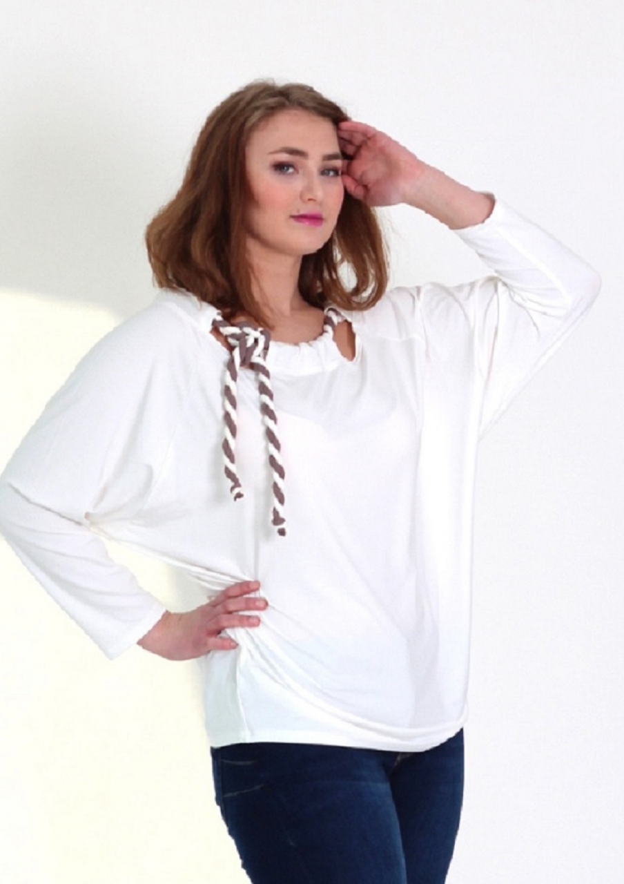 Volná tunika s netopýřimi rukávy z úpletu viskóza/elastan. Výstřih je zdobený zapletenou hnědo bílo  šňůrkou.