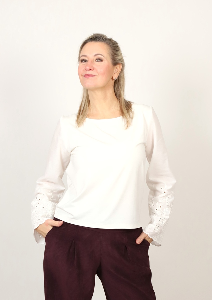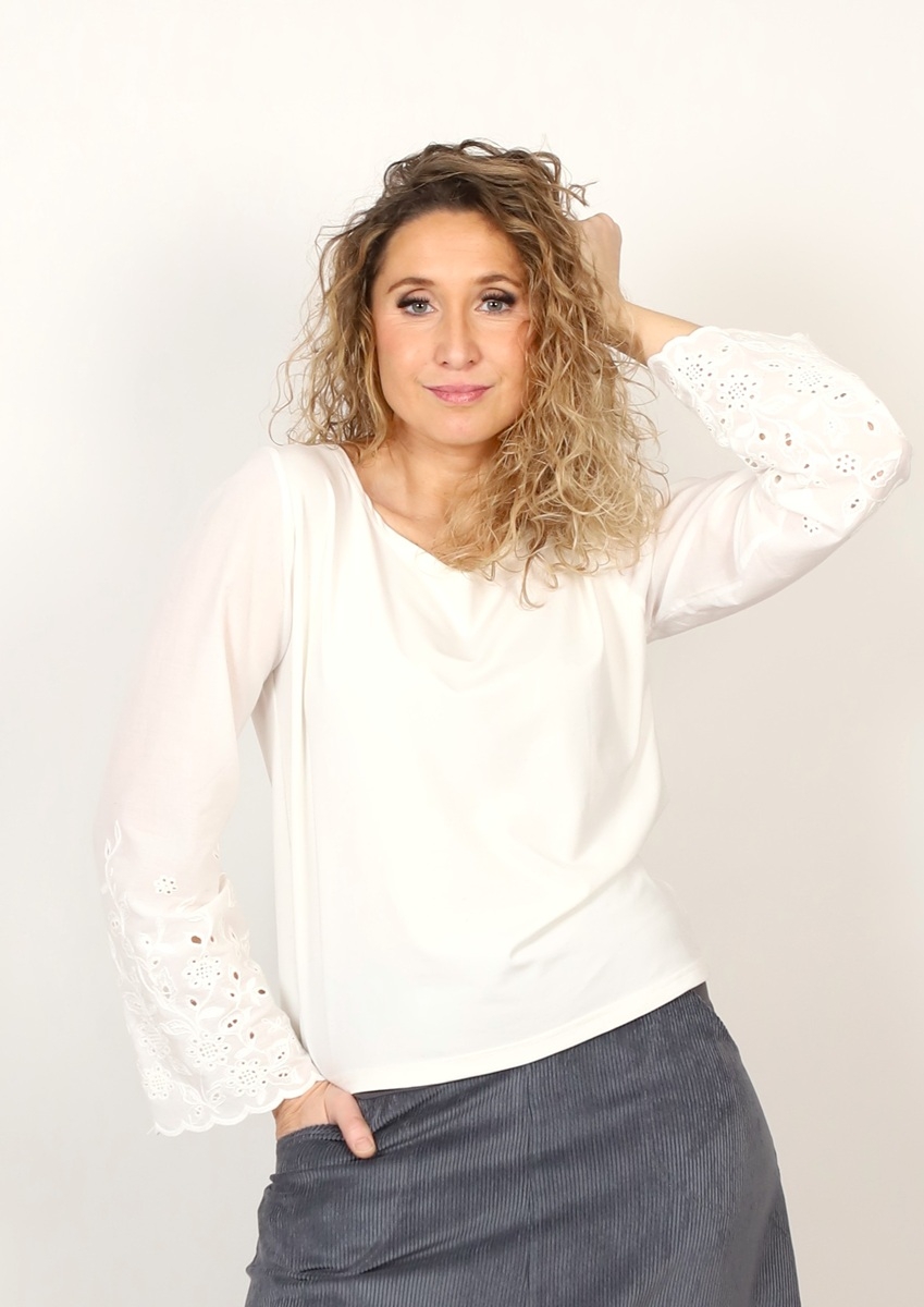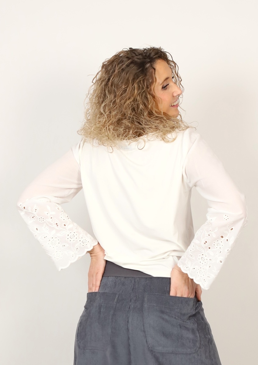 Tričko je ušité z úpletu viskóza/elastan se zdobenými krajkovými rukávy z bavlněné madeiry.
