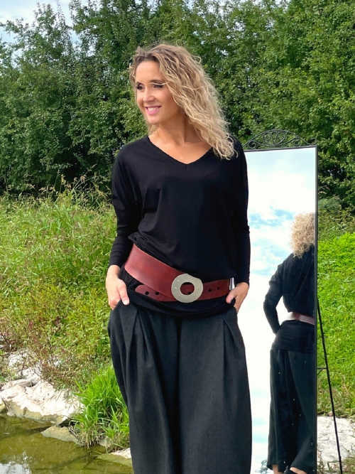 Volná tunika s netopýřimy rukávy v prodloužené délce s rozparky. Materiál je úplet viskóza/elastan.
