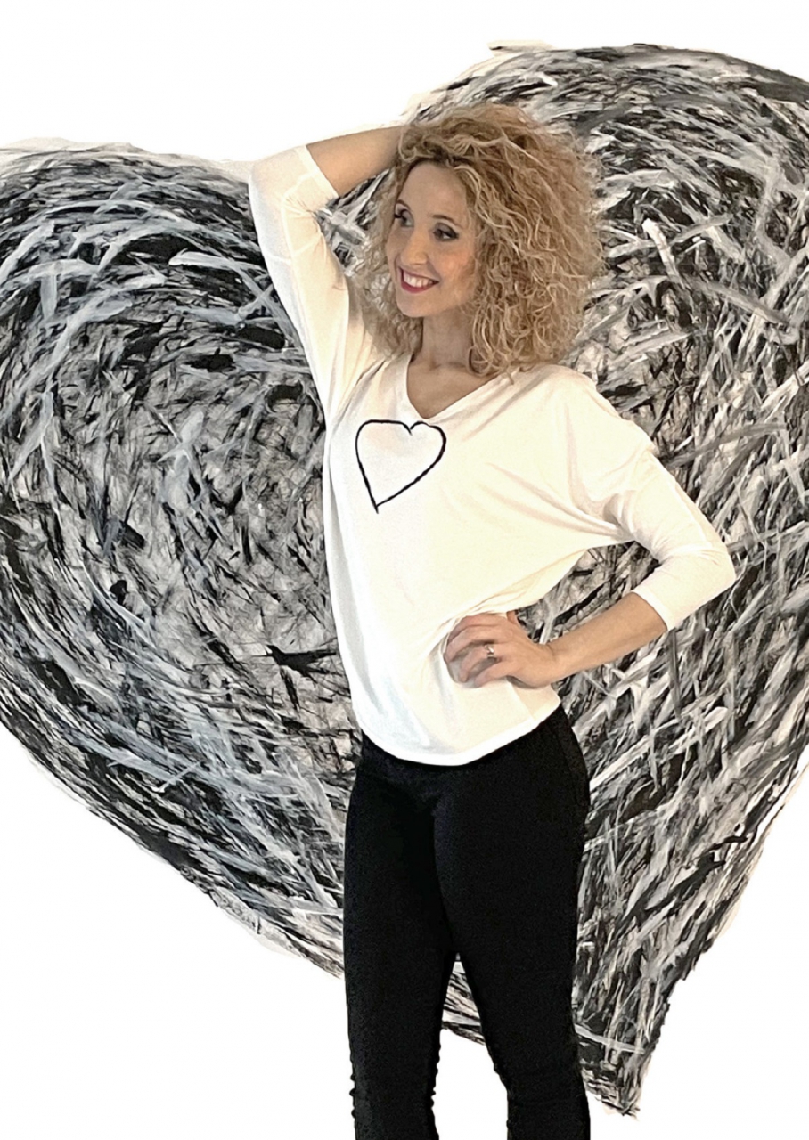 Volná tunika s netopýřimy rukávy z úpletu viskóza/elastan je zdobená ručně malovanými srdíčky.