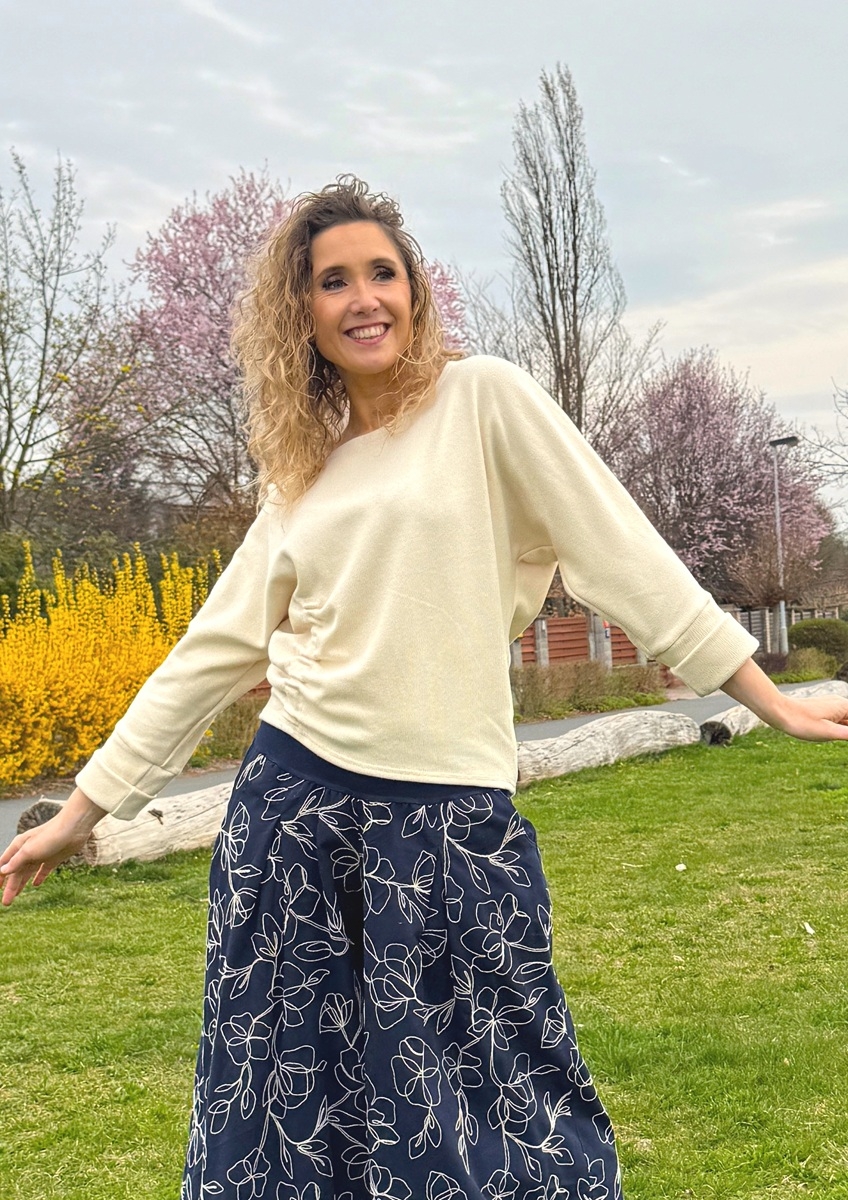 Top je ušitý z bavlněného svetrovéhoo úpletu s 3/4 rukávem a v pase na straně je nařasený gumičkou.