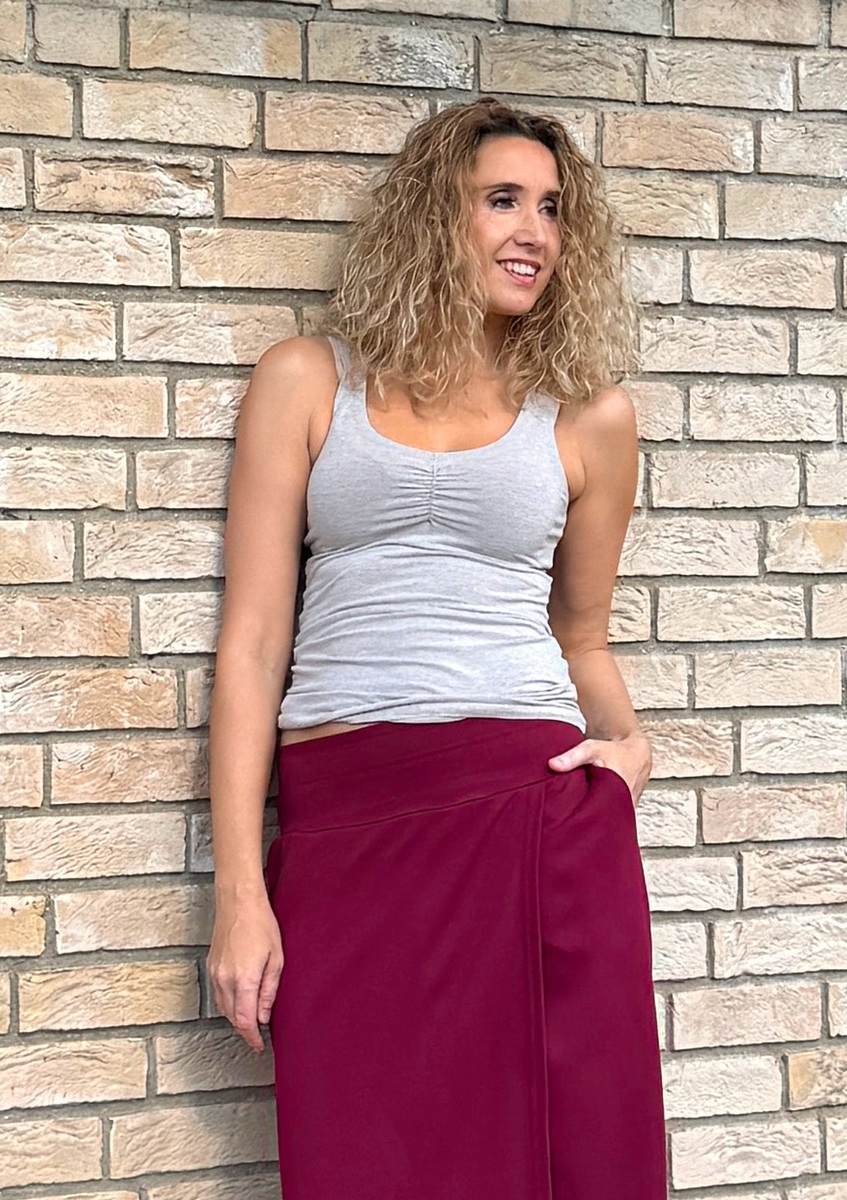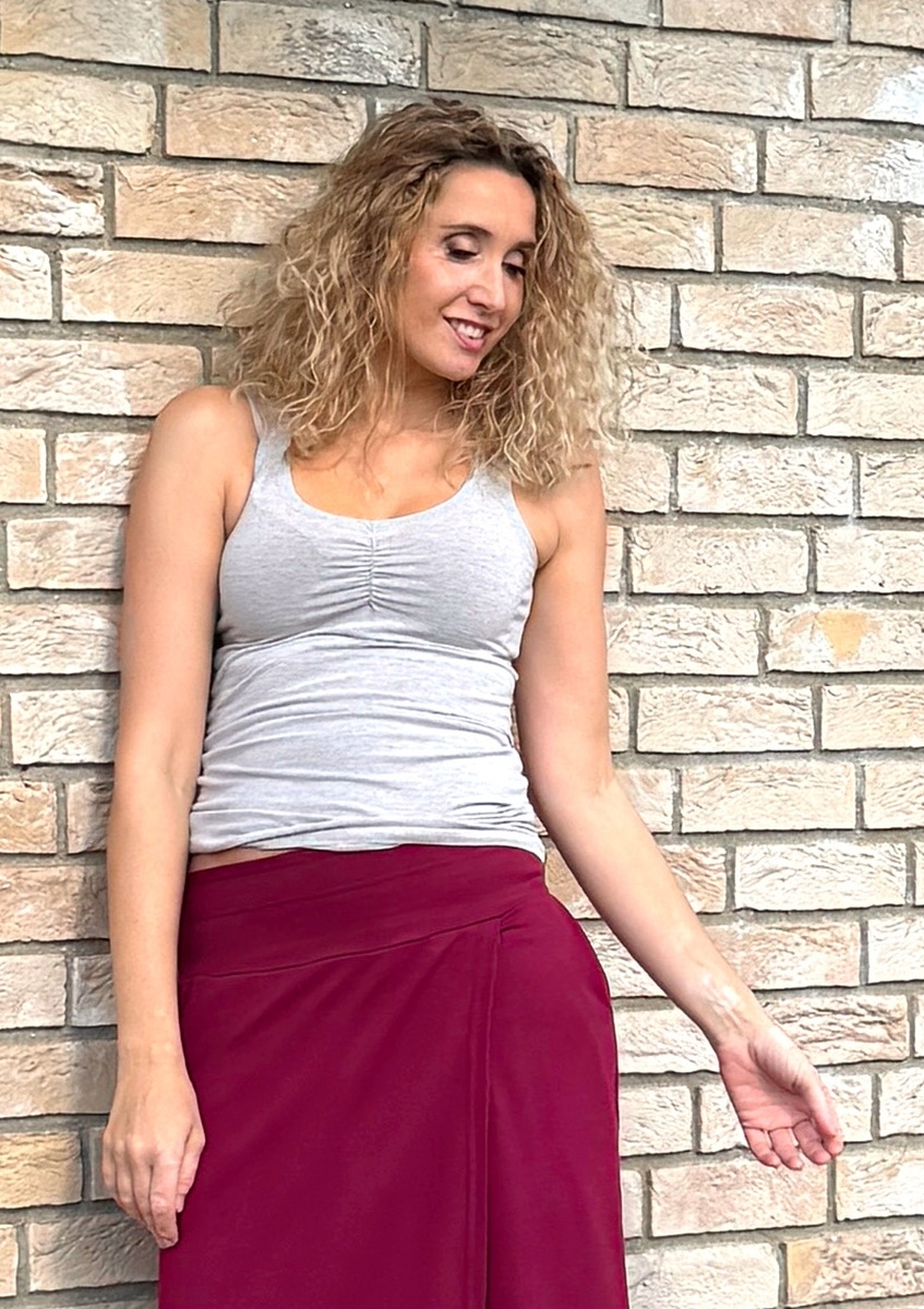 Tričko bez rukávů s nařasením na prsou.
