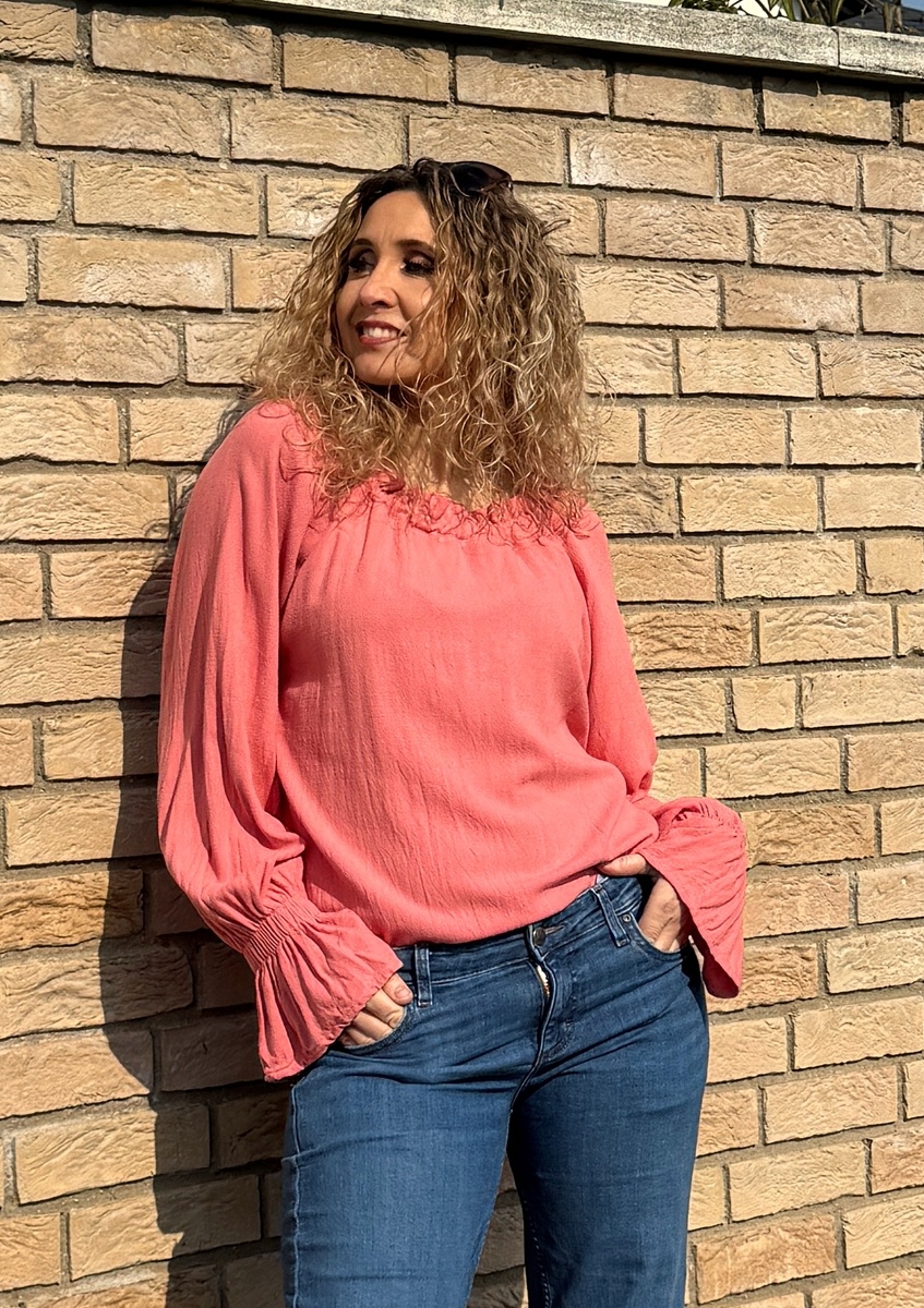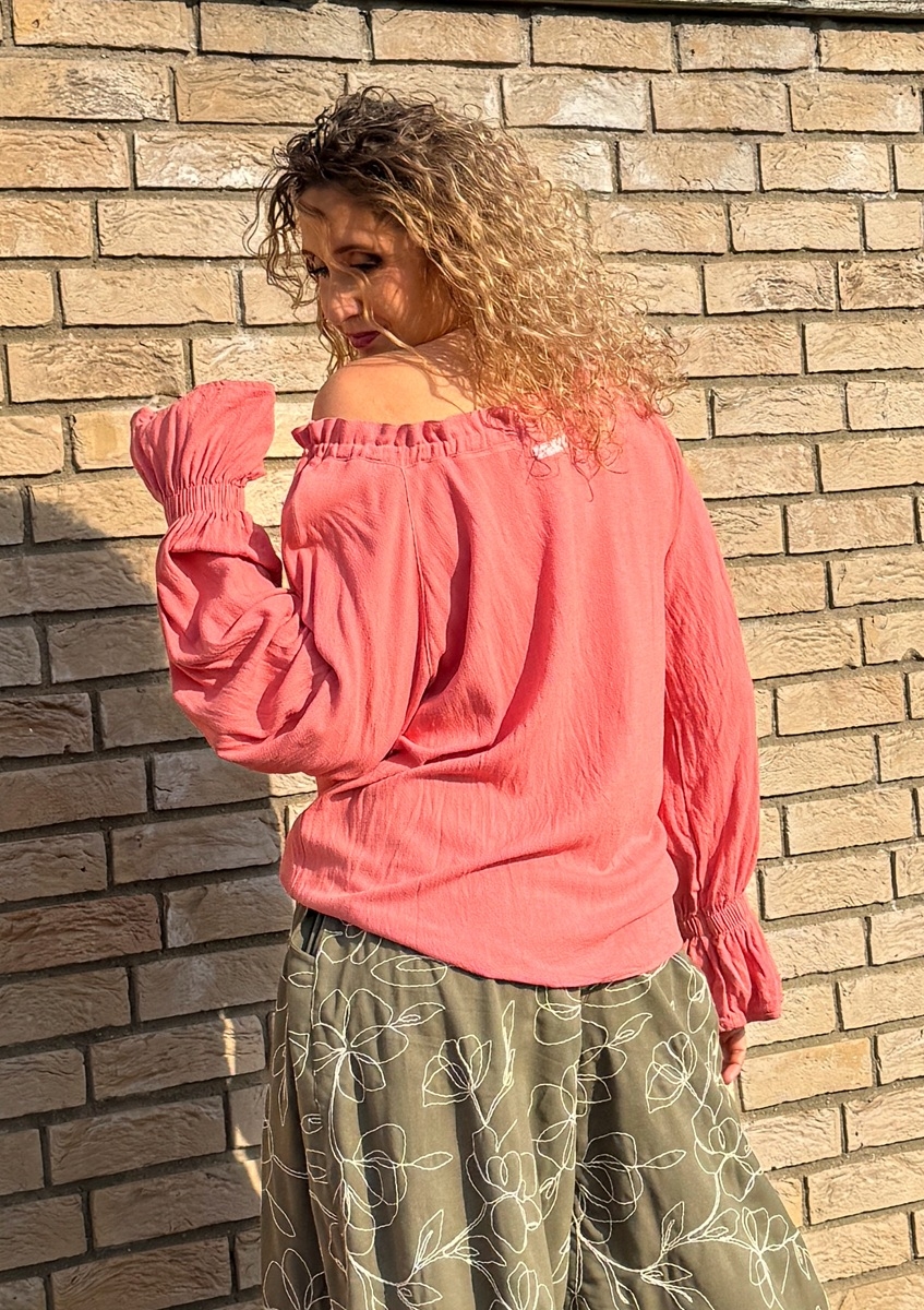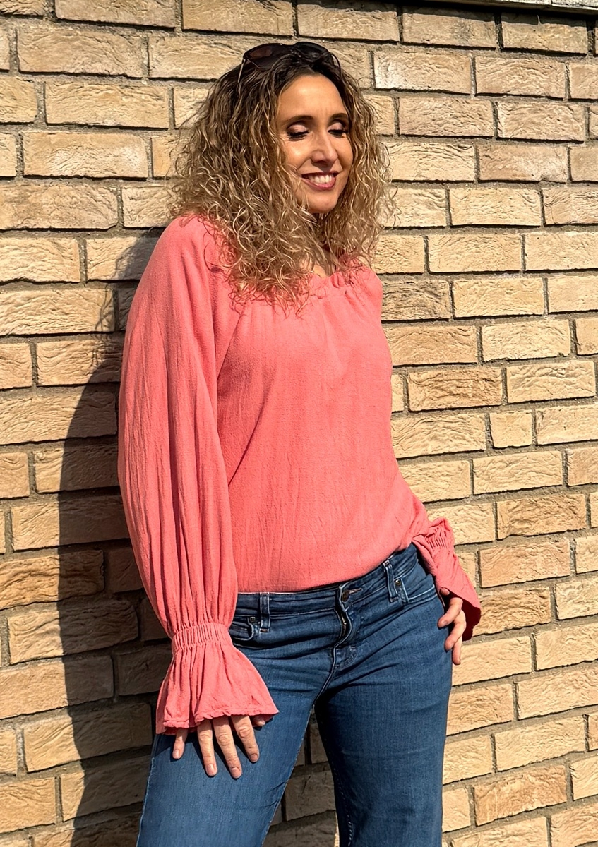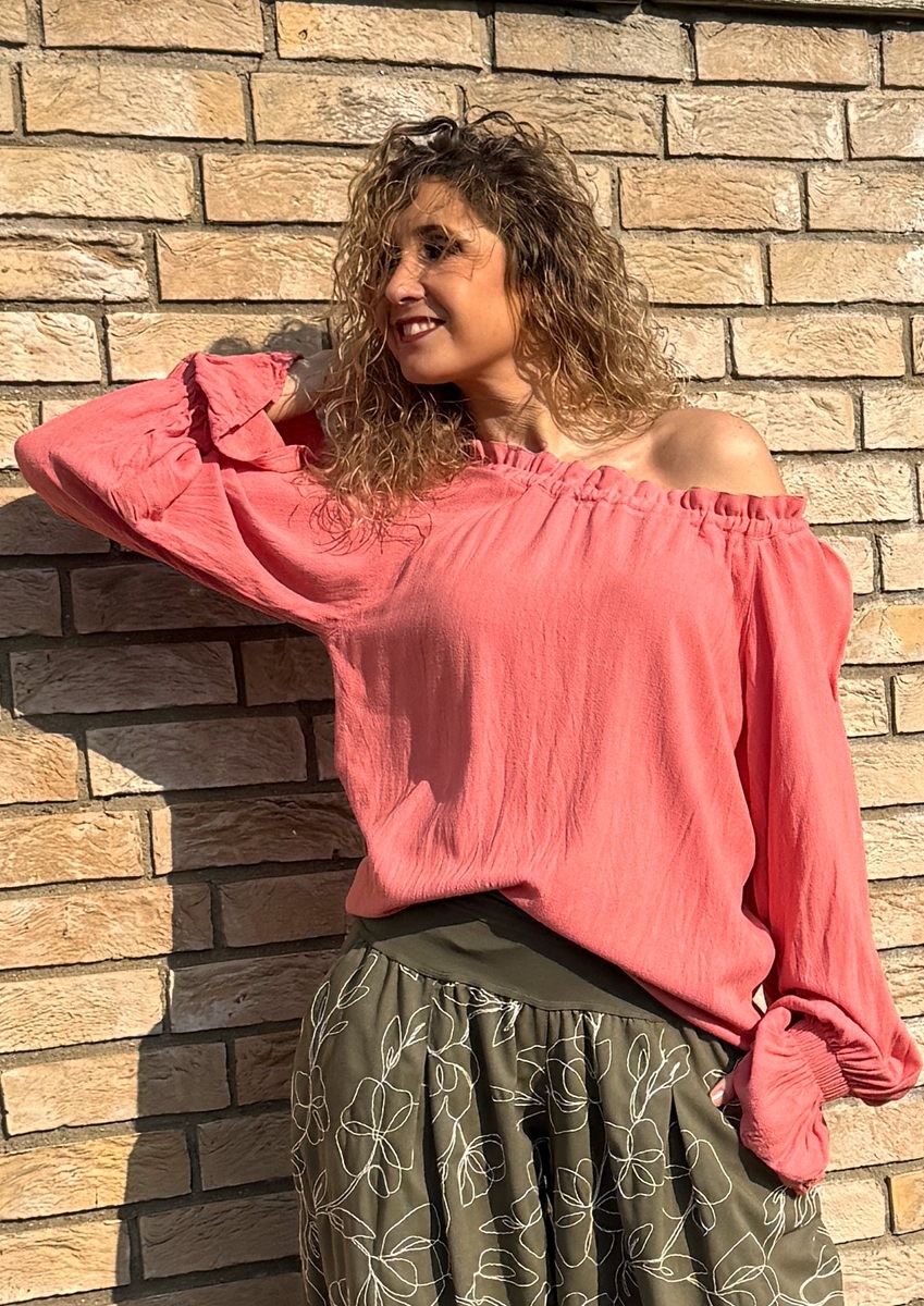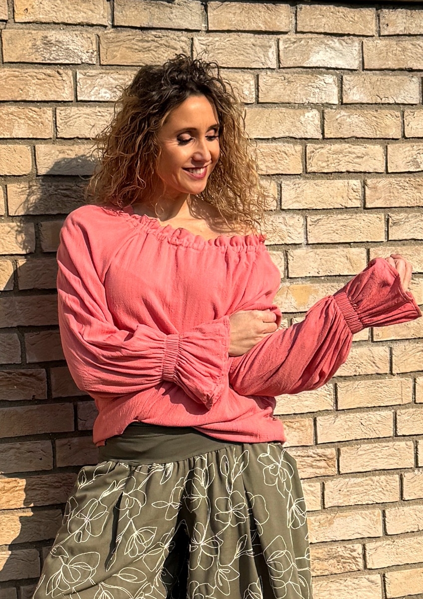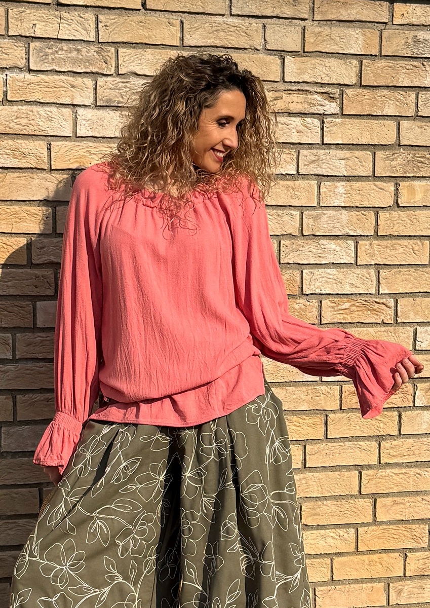 Volná tunika s dlouhými rukávy (řasené do gumičky) je ušitá z luxusního plandavého a měkkého materiálu viskóza 78% a len 22%. Výstřih je  stažený  do gumičky.