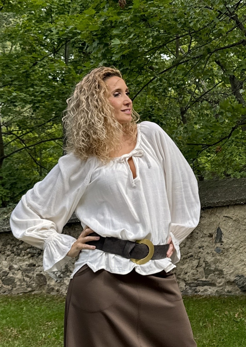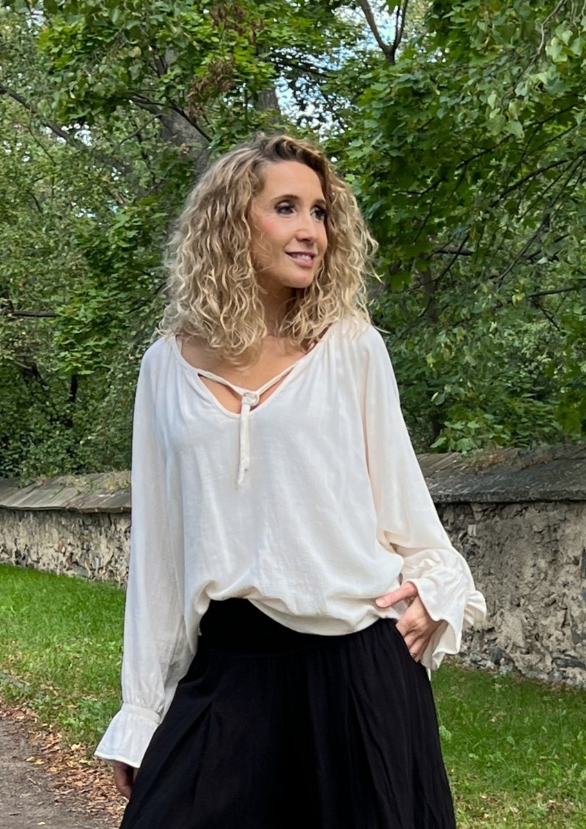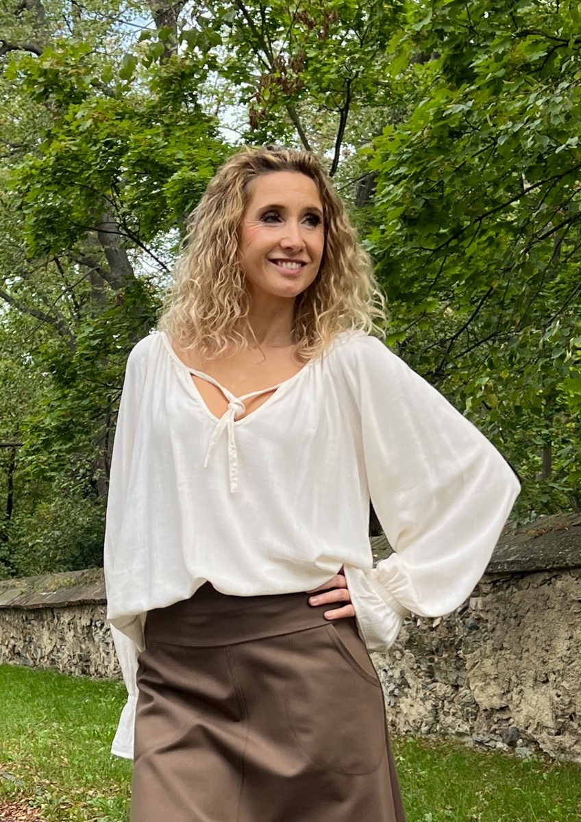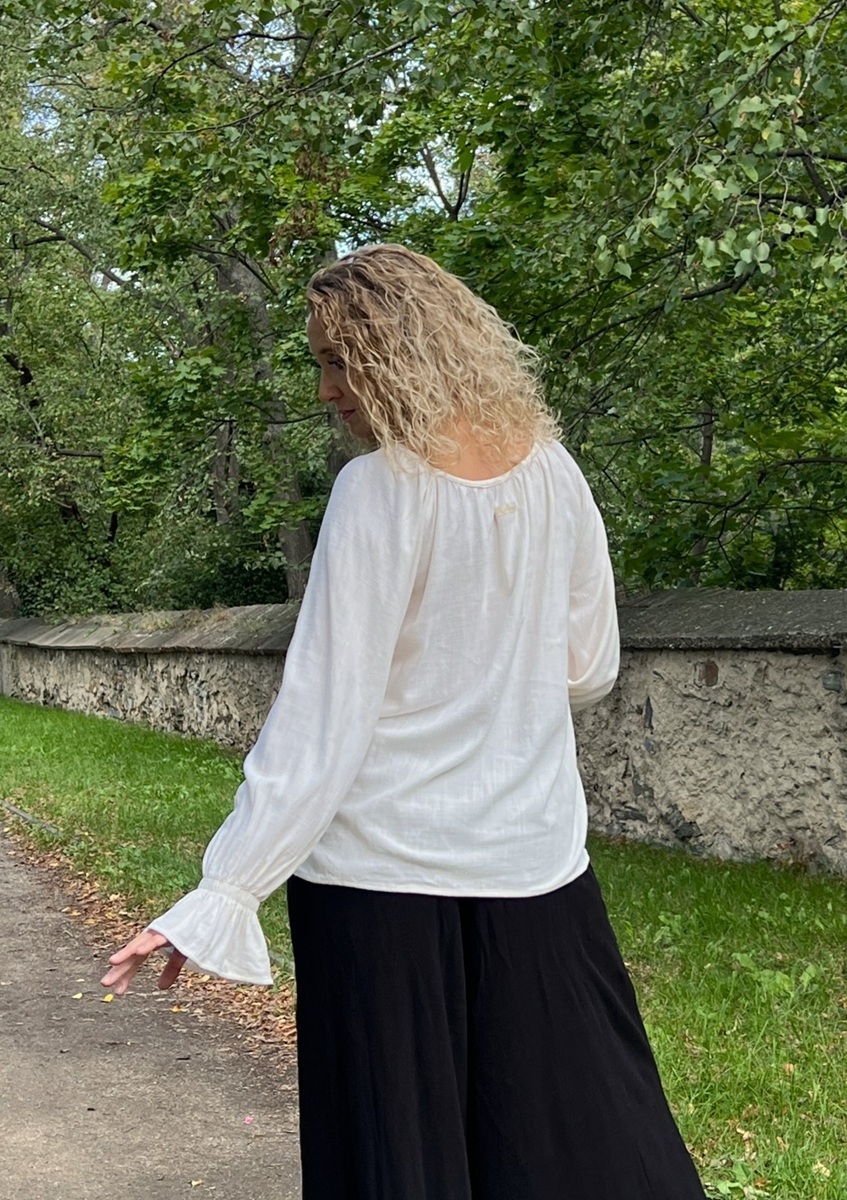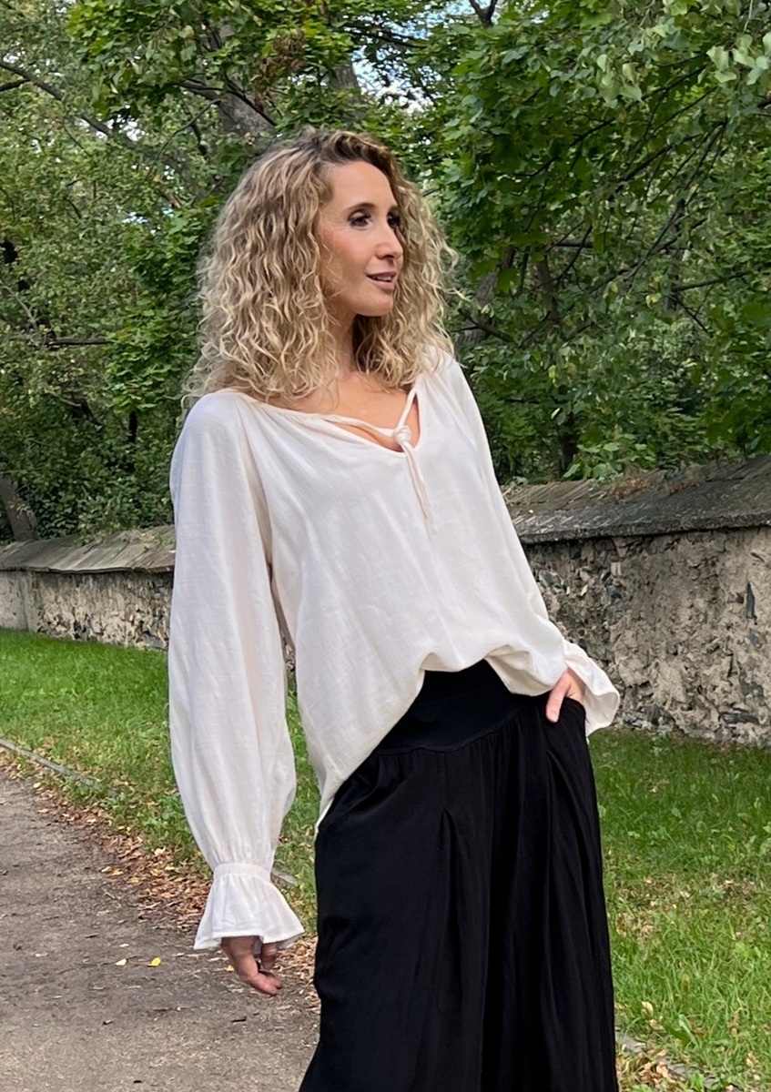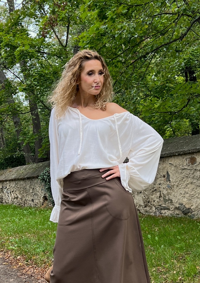 Volná tunika s dlouhými rukávy (stažené do gumičky) je ušitá z luxusního plandavého a měkkého materiálu viskóza 78% a len 22%.