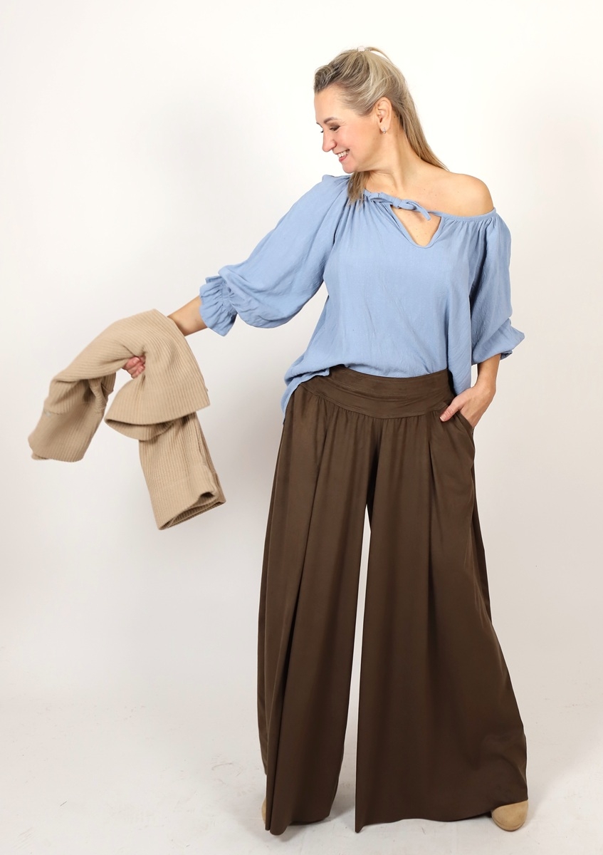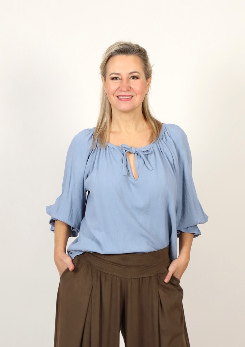 Volná tunika s 3/4 rukávy (stažené do gumičky) je ušitá z luxusního plandavého a měkkého materiálu viskóza 78% a len 22%.