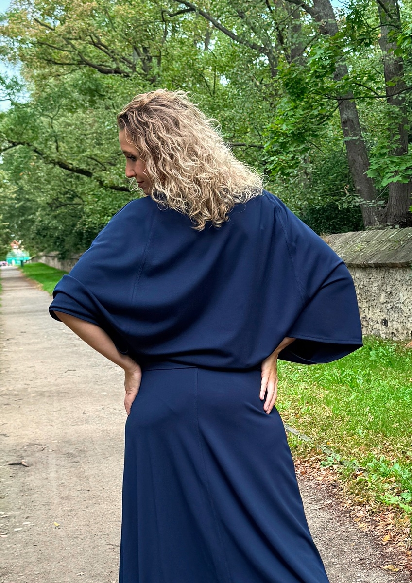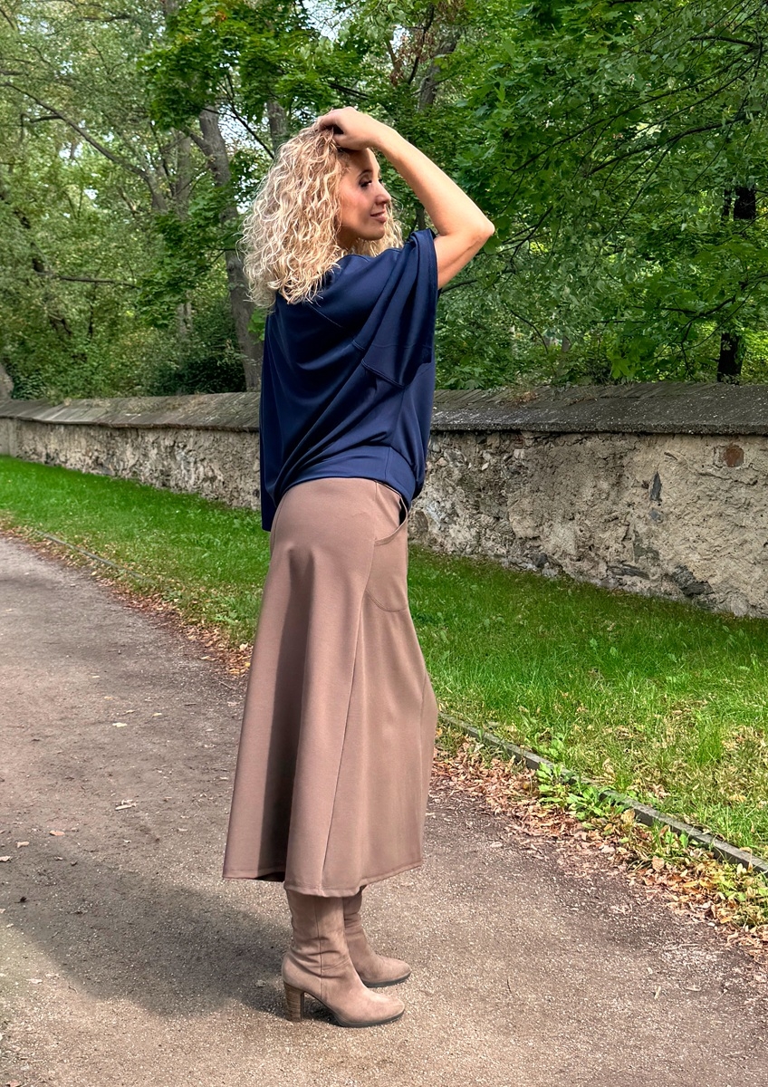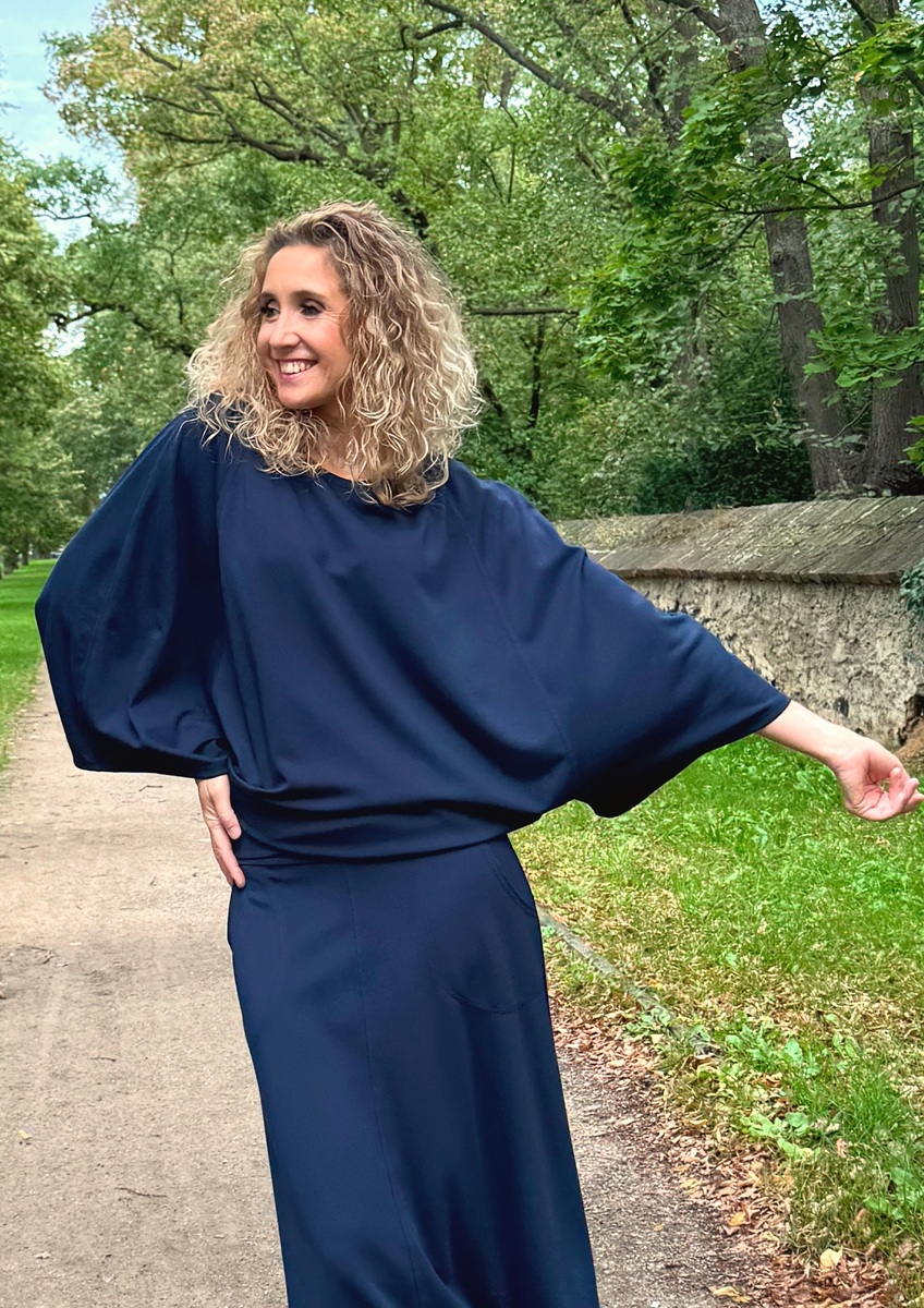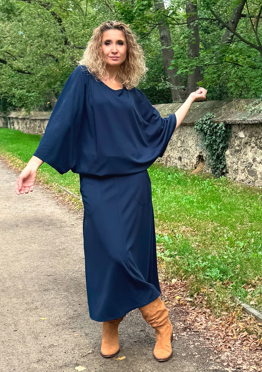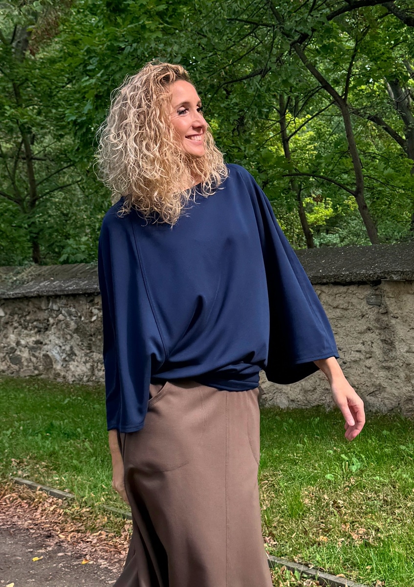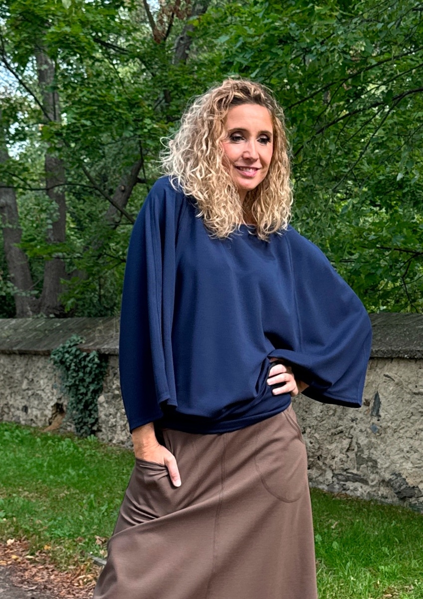 Volná tunika s netopýřími rukávy a volným výstřihem je ušitá ze směsového středně silného úpletu (měkký, pružný).
