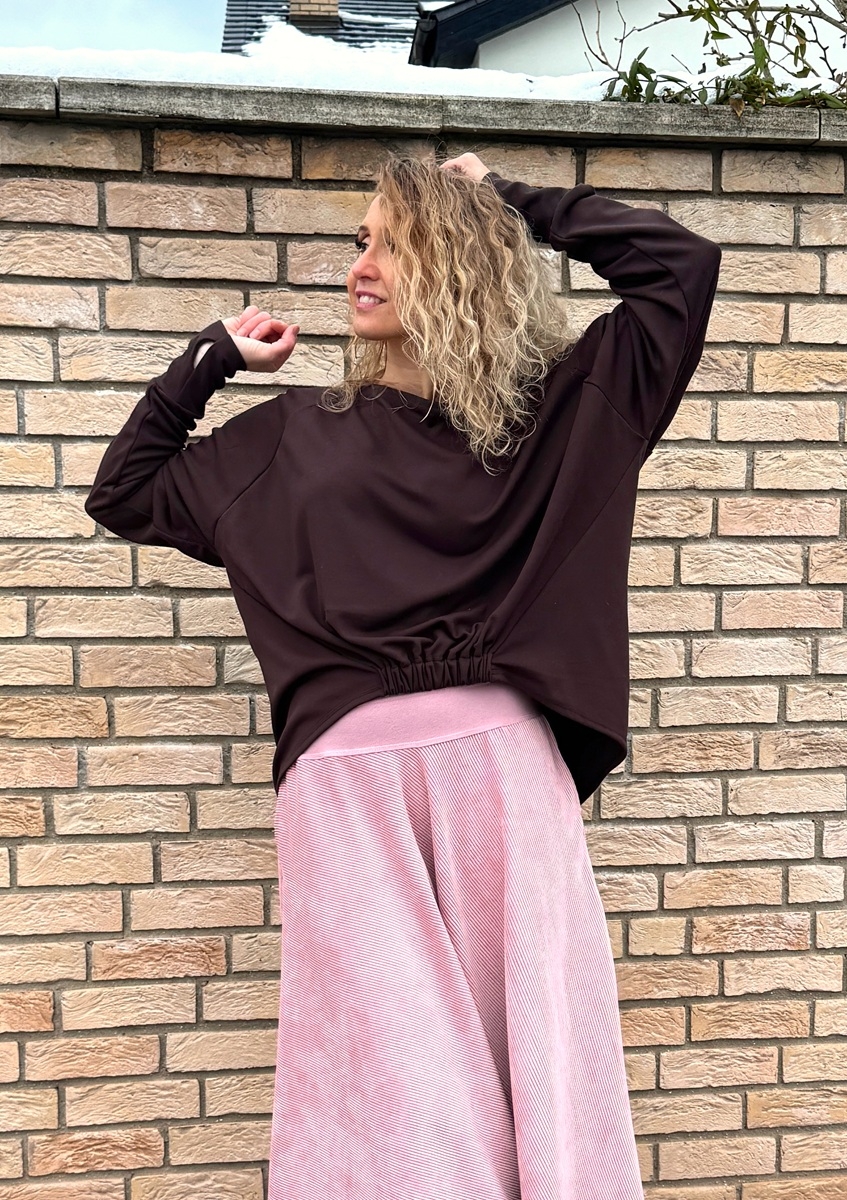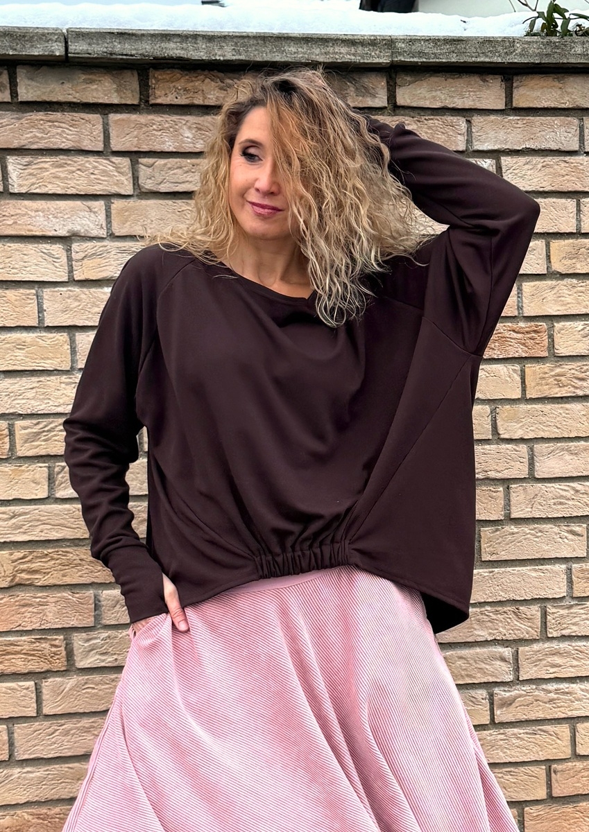 Má dlouhé rukávy se všitými nátepníky. Ne předním díle je v pase zdobený nařasením do široké gumy. Délka se mírně svažuje dozadu.