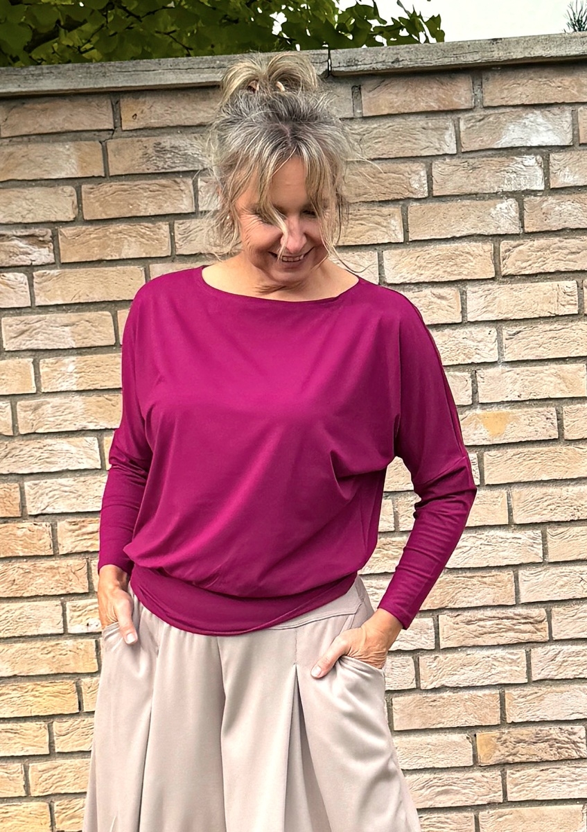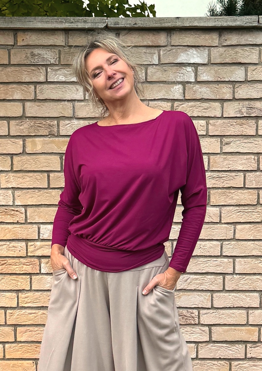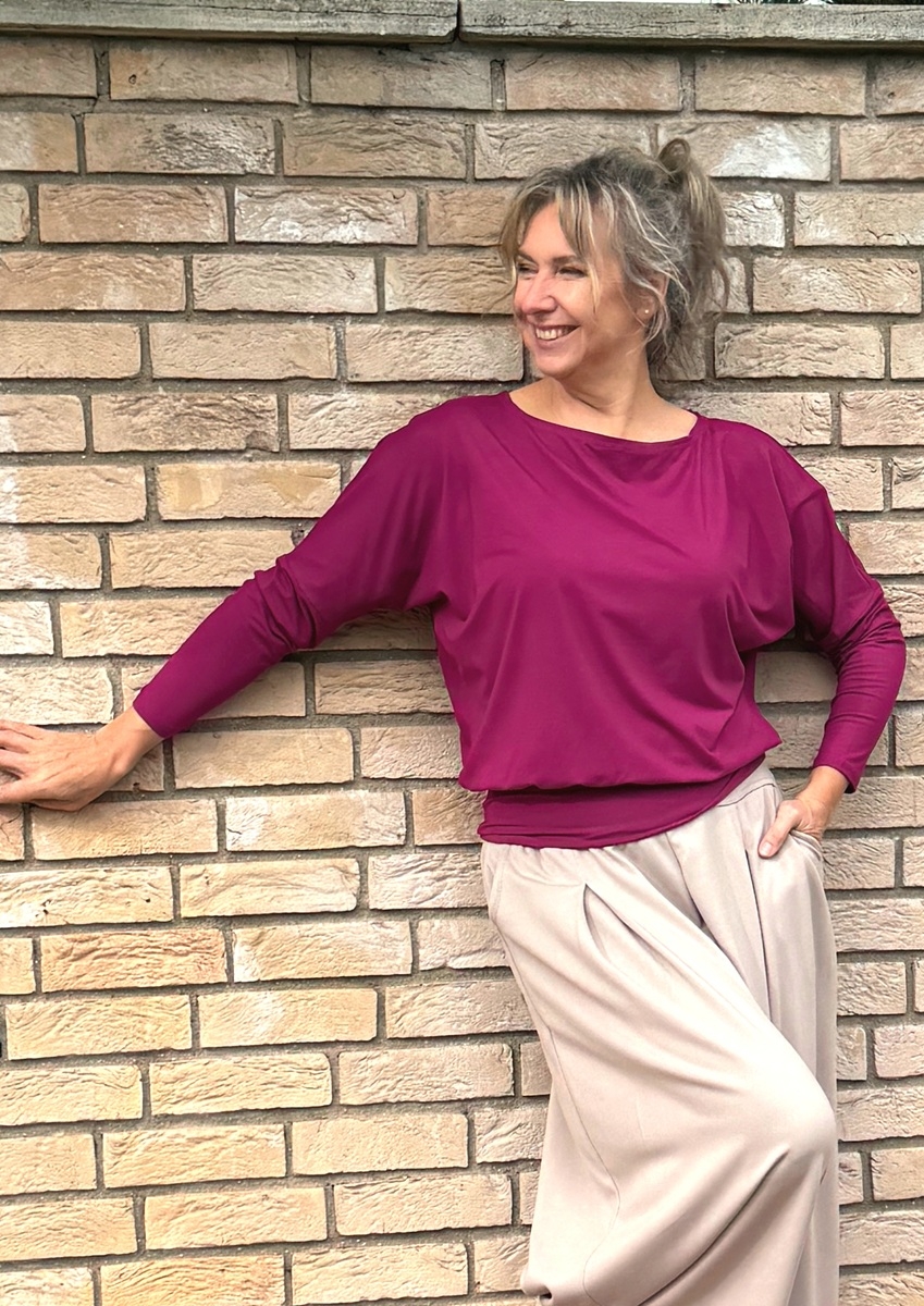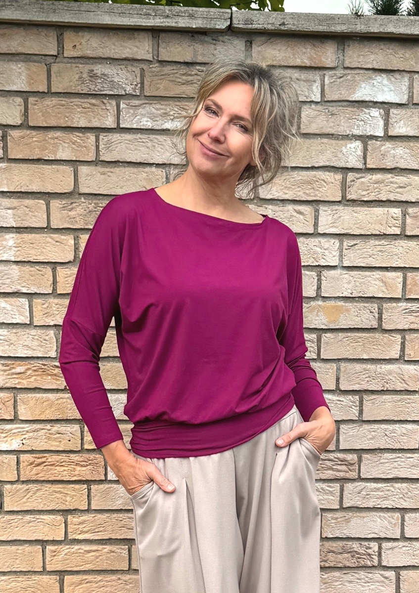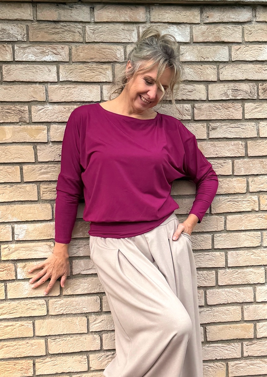 Tričko volného netopýřího střihu, které má spodní díl stažený do širokého pásku je ušité z úpletu viskóza/elastan. Rukávy jsou dlouhé.