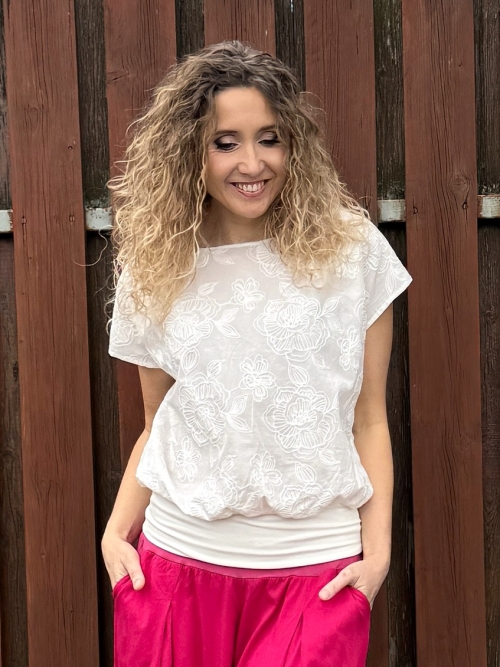 Tričko volného střihu, které má spodní díl stažený do širokého pásku je ušité z bavlněné madeiry.