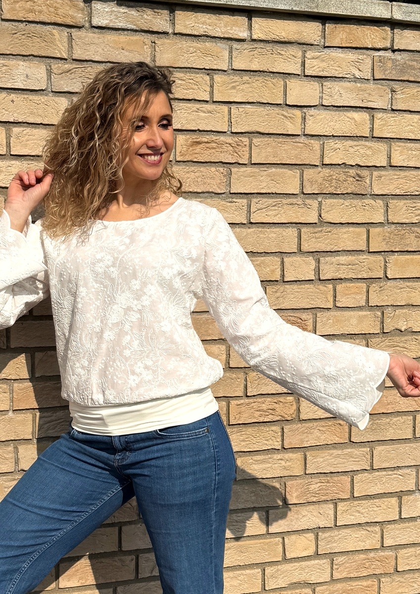 Tričko volného střihu, které má spodní díl stažený do širokého pásku je ušité z bavlněné madeiry. S dlouhým rukávem.