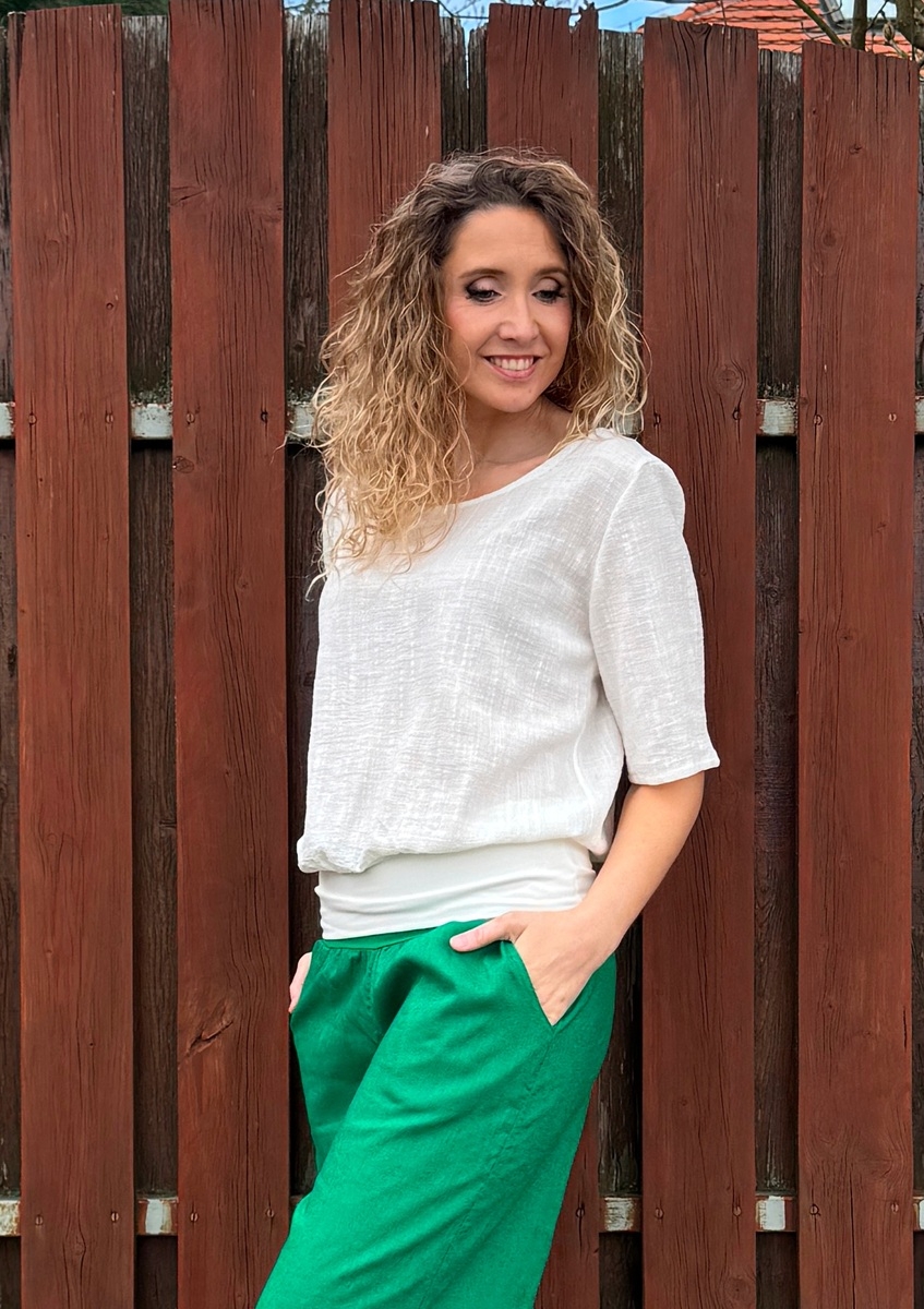 Tričko volného střihu, které má spodní díl stažený do širokého pásku je ušité z lehké bavlněné gázoviny. Krátký rukáv.