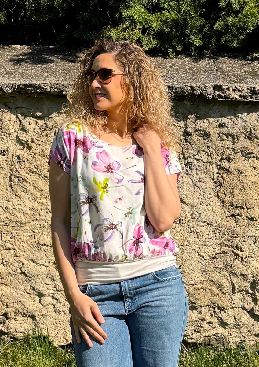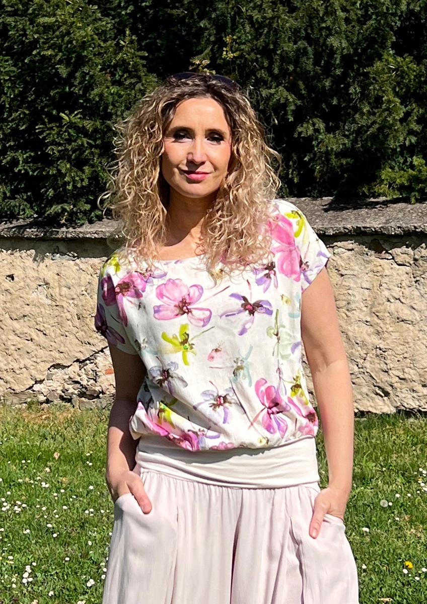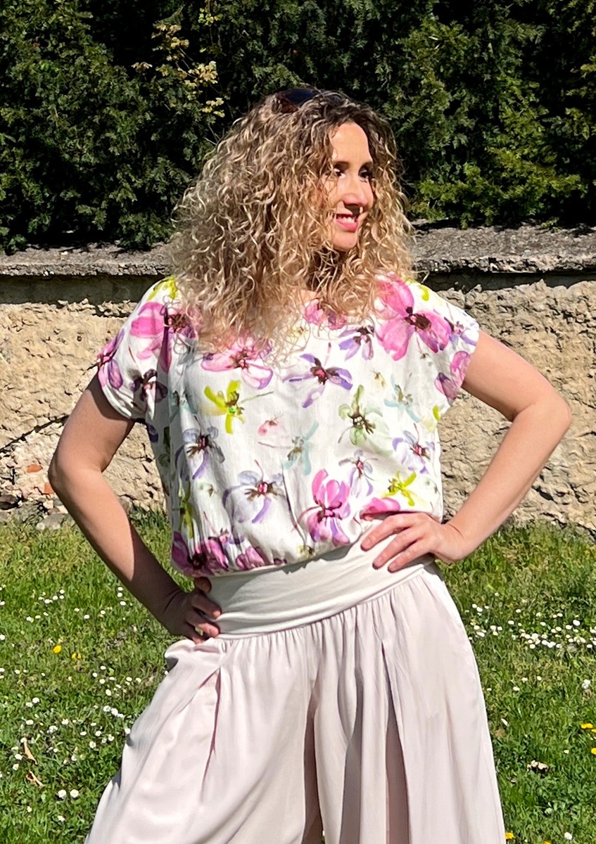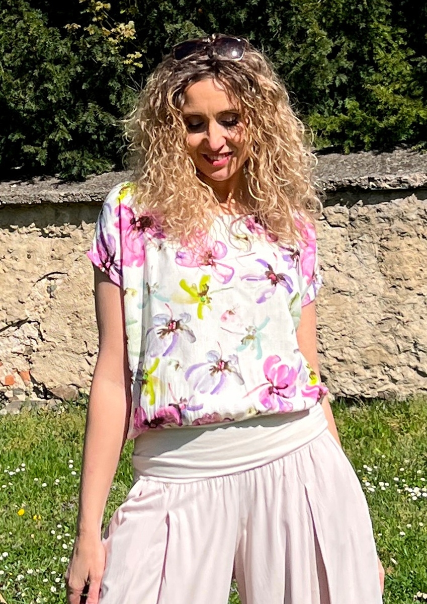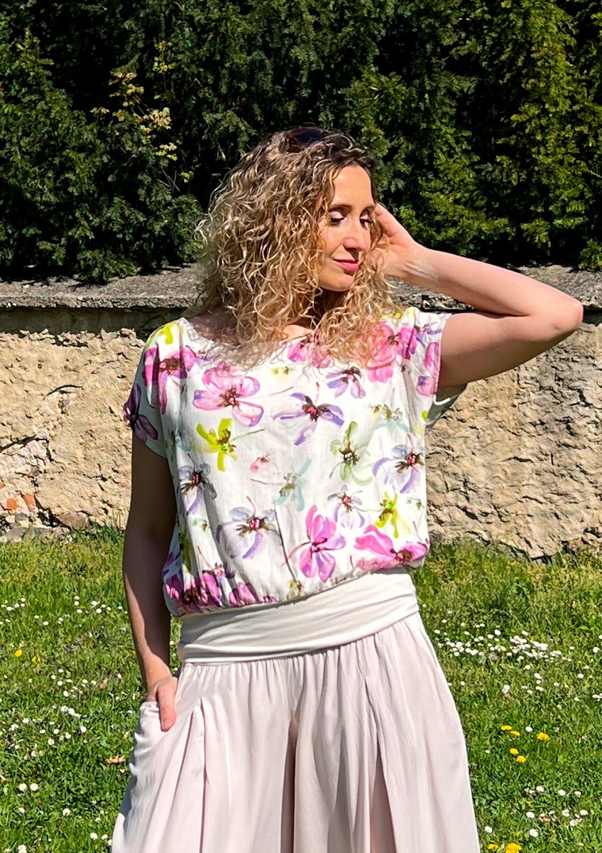 Tričko volného střihu, které má spodní díl stažený do širokého pásku. Příjemný materiál je směs viskózy a lnu.