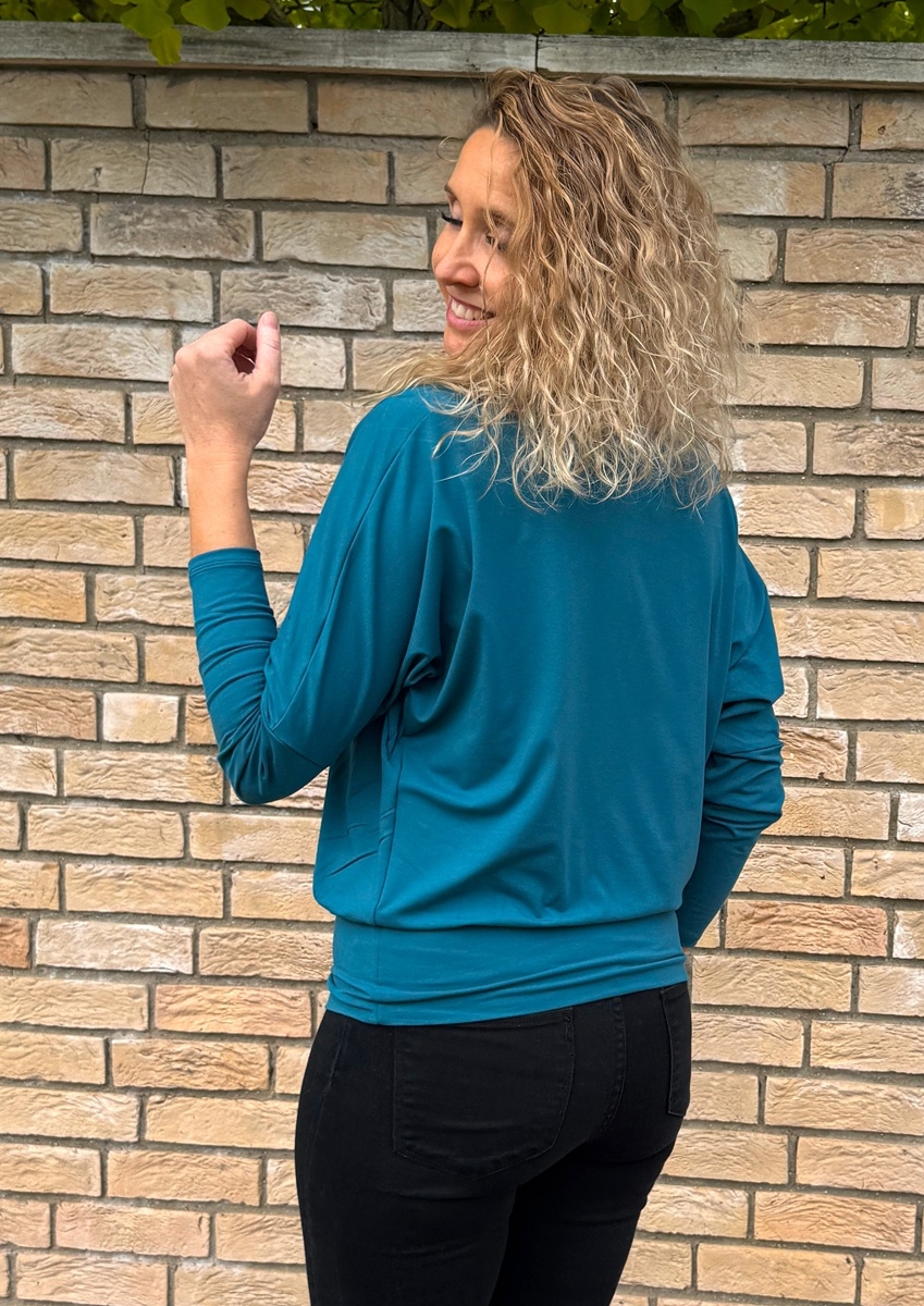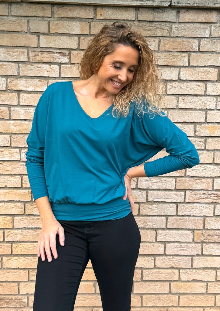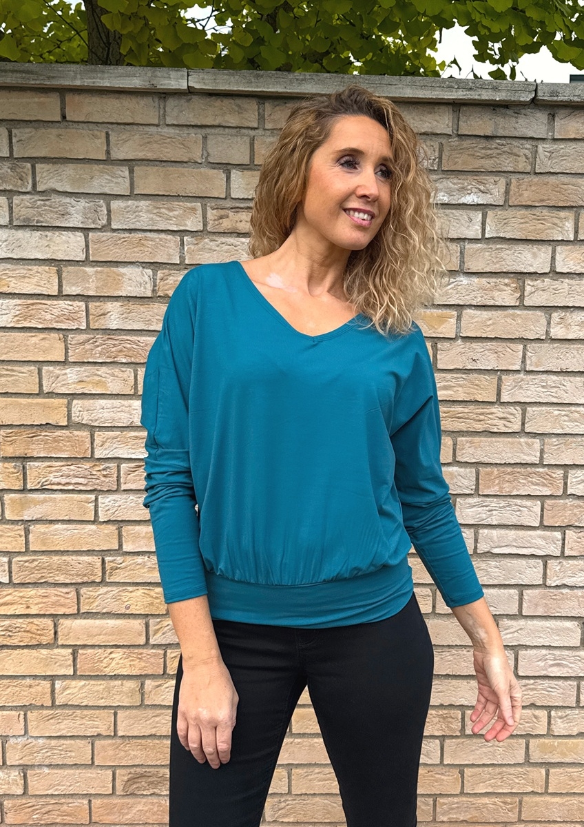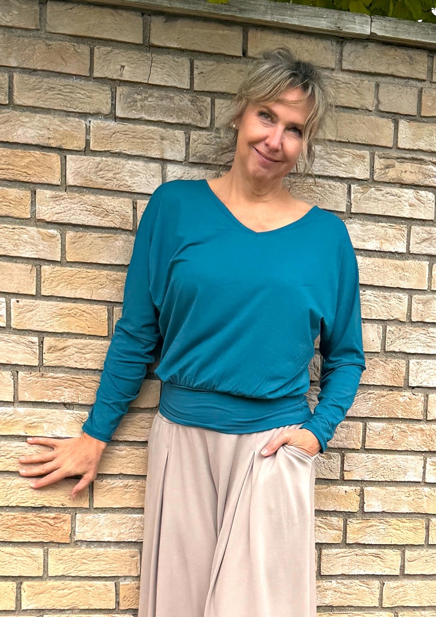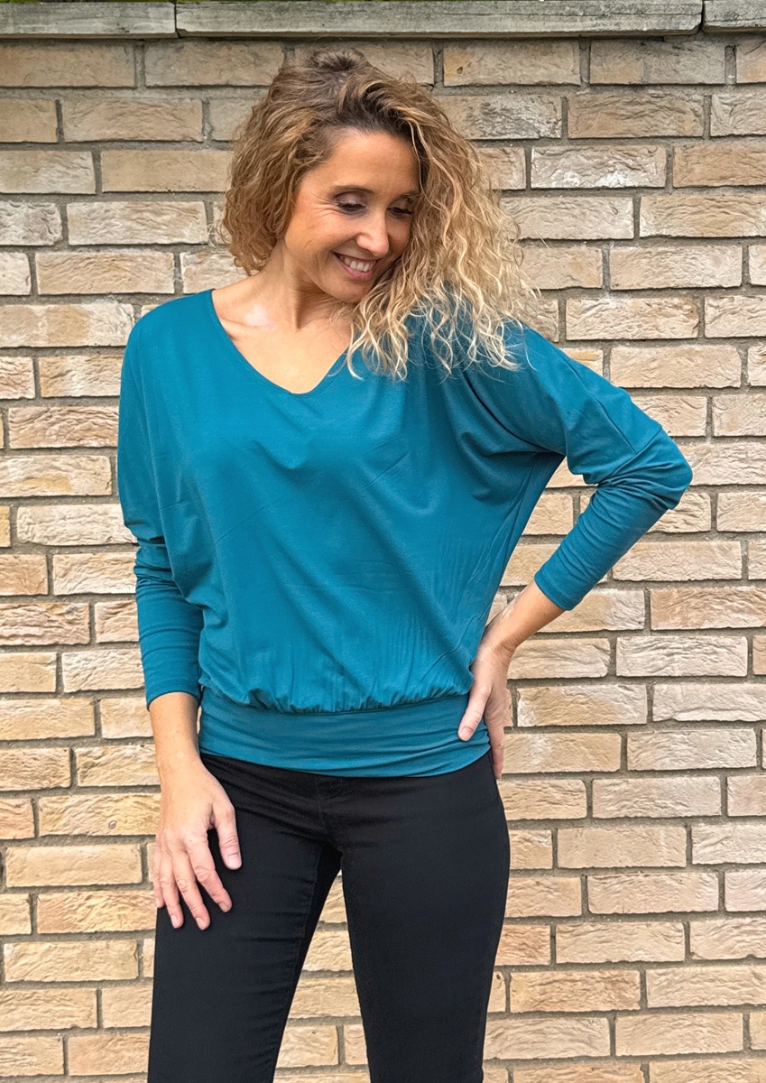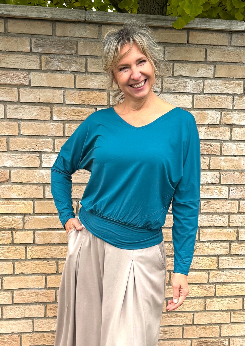 Tričko volného netopýřího střihu, které má spodní díl stažený do širokého pásku je ušité z úpletu viskóza/elastan. Rukávy jsou dlouhé s výstřihem do V.