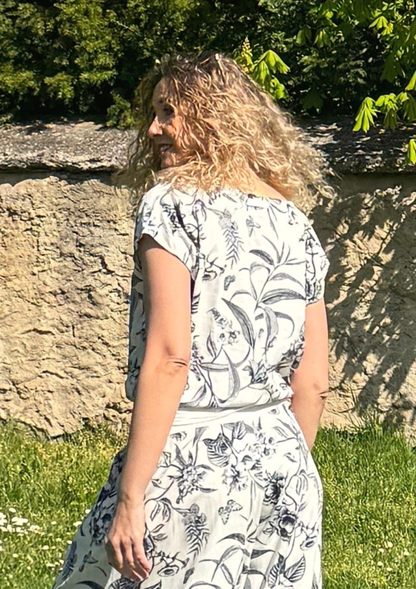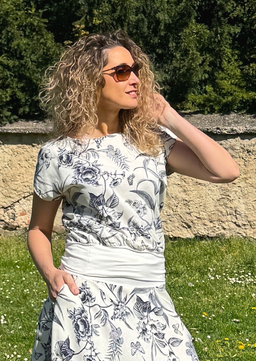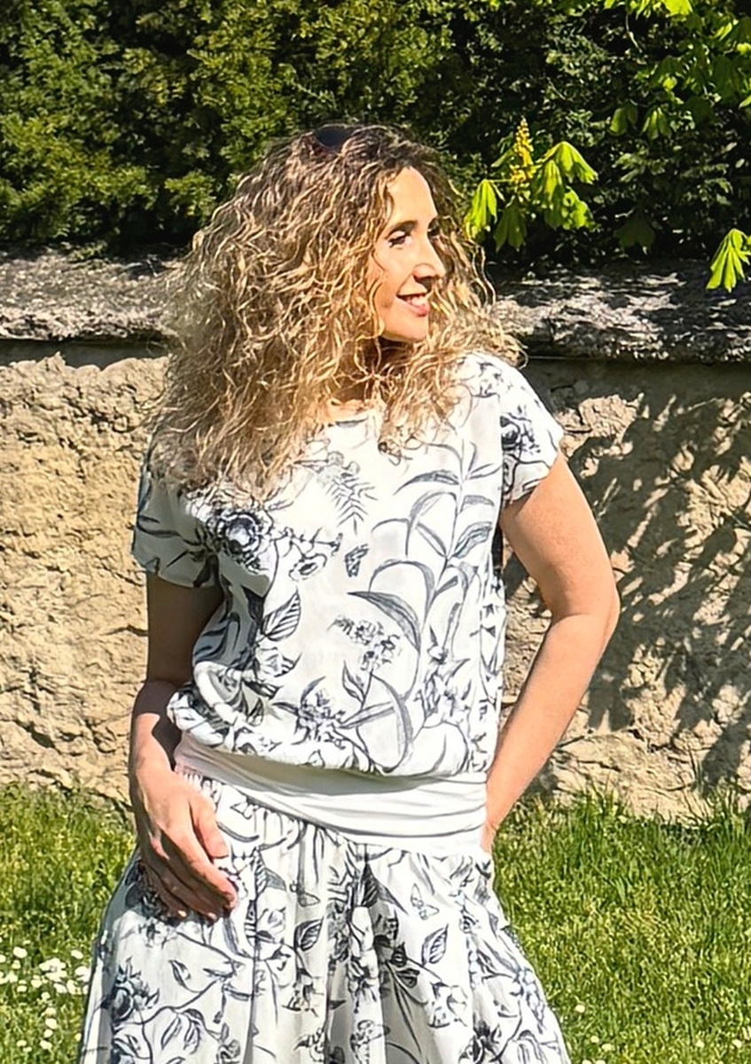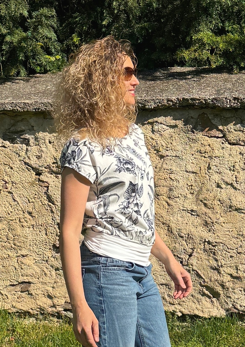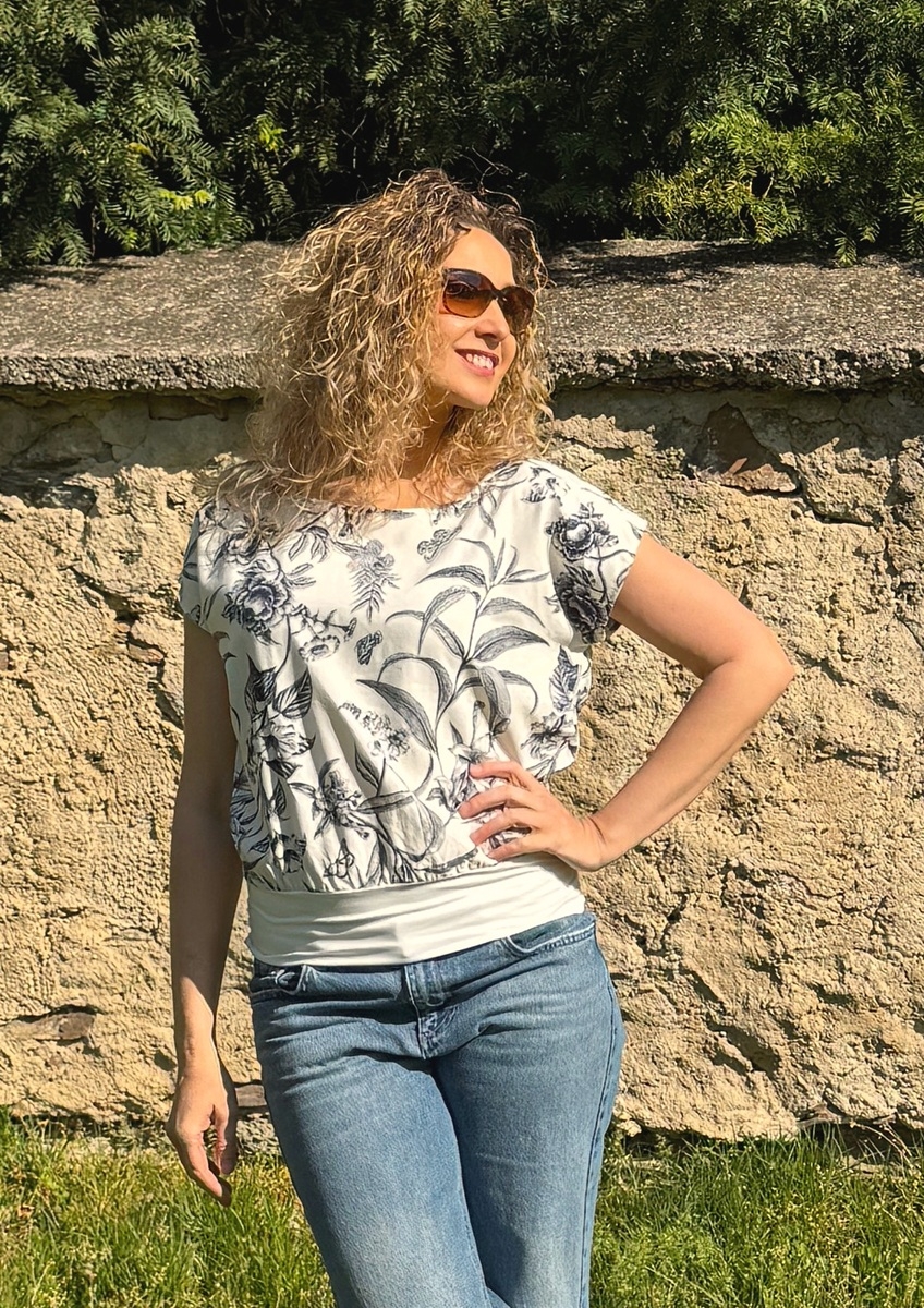 Tričko volného střihu, které má spodní díl stažený do širokého pásku. Příjemný materiál je směs viskózy a lnu.