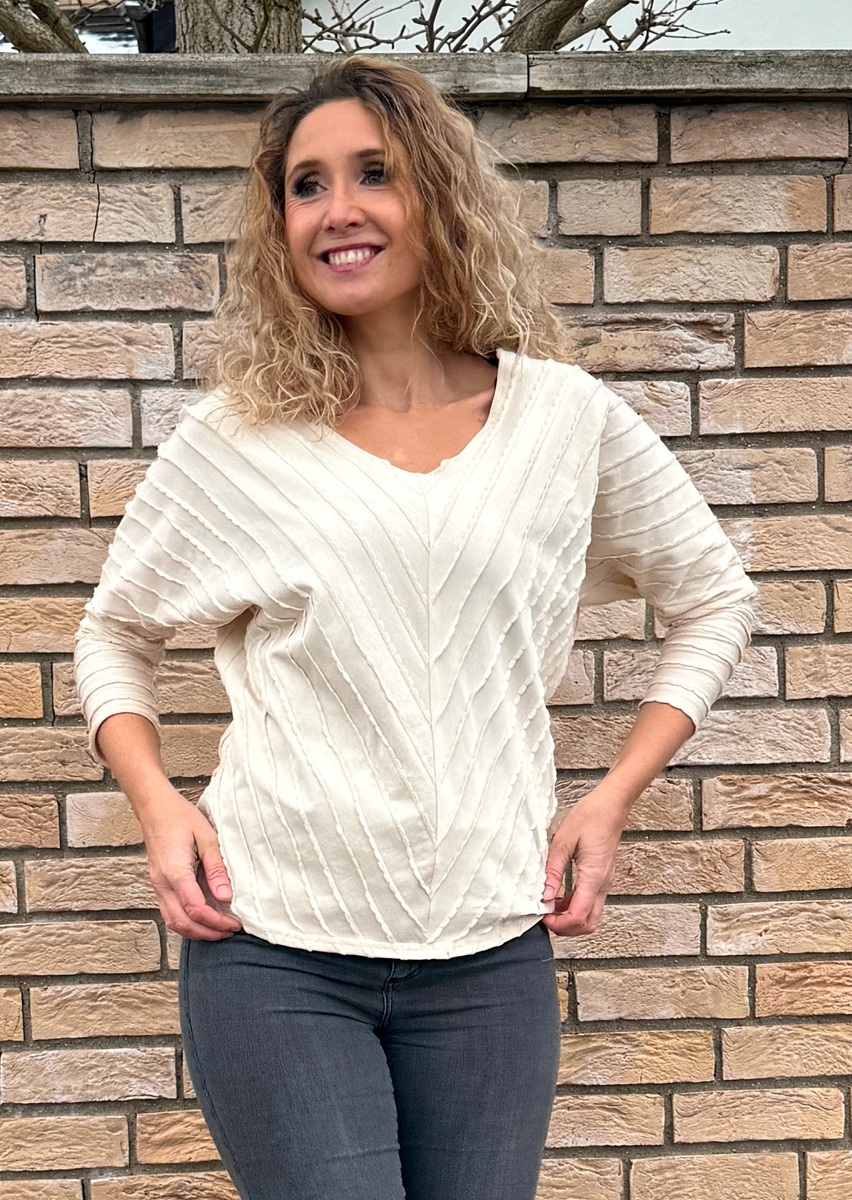 Tunika volného netopýřího střihu s výstřihem do V je ušitá z příjemného bavlněného upletu (95% bavlna/5%elastan)  s plastickým vzorem. Rukávy jsou ve 3/4 délce.